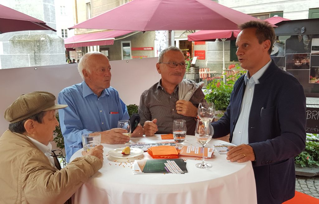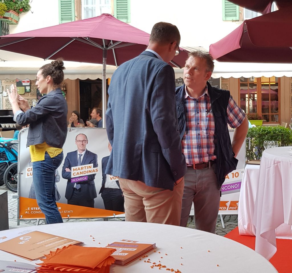 Momento conviviale e scambio di opinioni sulla piazza di Poschiavo per i candidati PDC in corsa per le elezioni federali che per la speciale occasione si sono incontrati con la popolazione locale. Per il Cantone dei Grigioni in lista per l'elezione del Consiglio degli Stati: Stefan Engler (in carica) e per l'elezione del Consiglio nazionale, Martin Candinas (in carica), Carmelia Maissen, Franz Sepp Caluori, Yvonne Brigger-Vogel e Gianna Luzio.