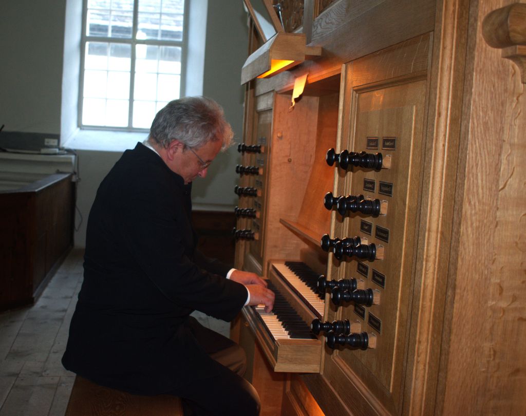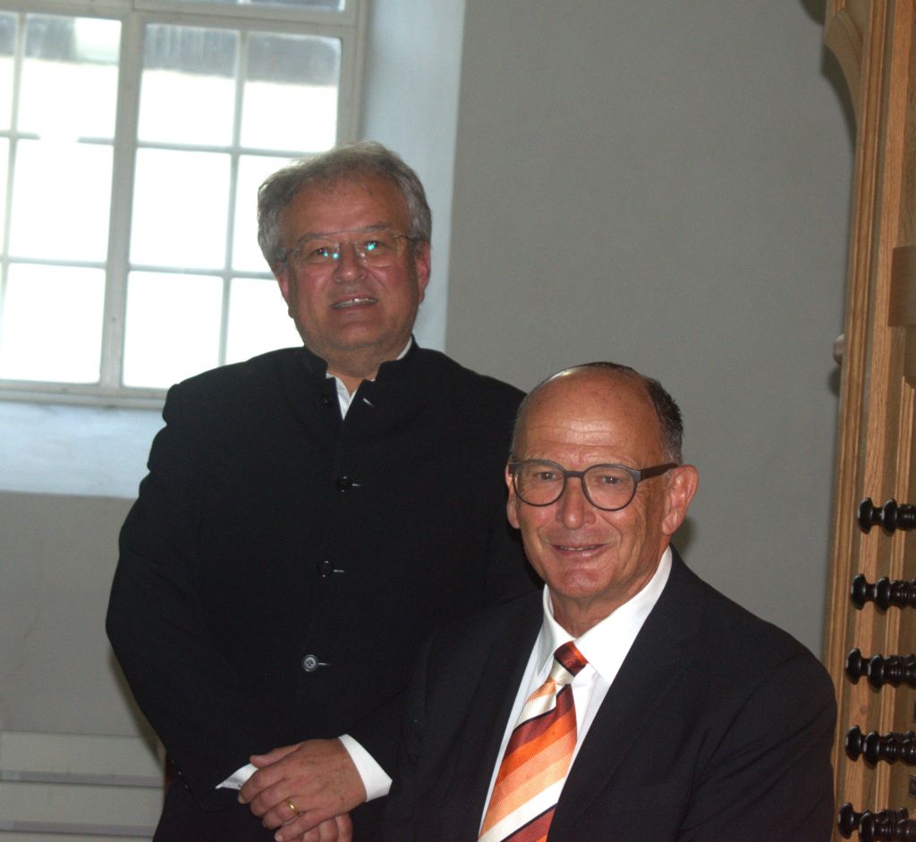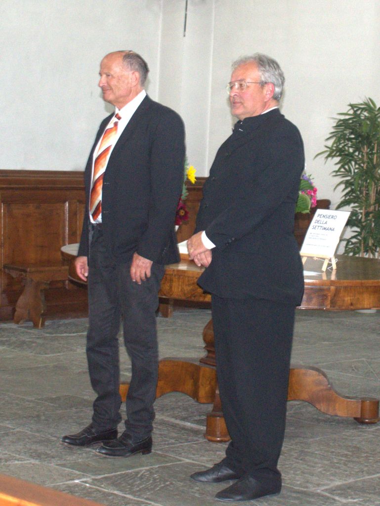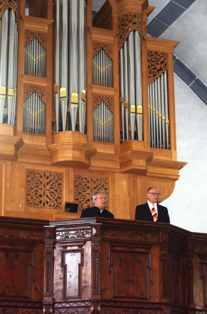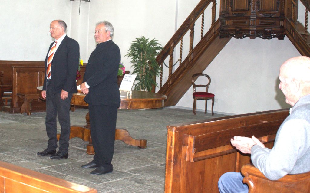 Gli organisti grigionesi Andrea Kuratle e Stephan Thomas, insegnanti e concertisti di grand talento ed esperienza, hanno deliziato la platea interpretando brani di Bach e composizioni del Maestro locale e si sono alternati allo strumento.