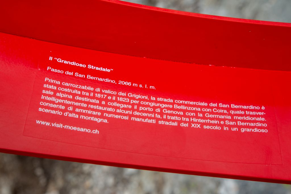 Da sabato scorso anche San Bernardino è provvisto del suo Photo Spot divenendo a tutti gli effetti una tappa fotografica del Gran Tour of Switzerland con il suo meraviglioso scorcio paesaggistico sulla vallata sottostante. Sulla cornice rossa, posta in prossimità dell’ultimo tornante della strada che conduce al Passo dal villaggio, è riportata questa dicitura: «Il Grandioso stradale. Passo del San Bernardino, 2066 m s.l.m. Prima carrozzabile di valico dei Grigioni, la strada commerciale del San Bernardino è stata costruita tra il 1817 e il 1823 per congiungere Bellinzona con Coira, quale trasversale alpina destinata a collegare il porto di Genova con la Germania meridionale. Intelligentemente restaurato alcuni decenni fa, il tratto tra Hinterrhein e San Bernardino consente di ammirare alcuni manufatti stradali del XIX secolo in un grandioso scenario di alta montagna». Il dato storico mette in evidenza anche l’importanza della stessa strada percorsa intesa come testimonianza storica vissuta.