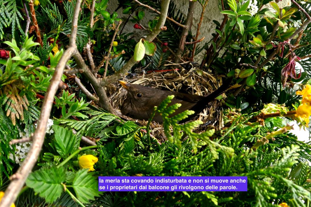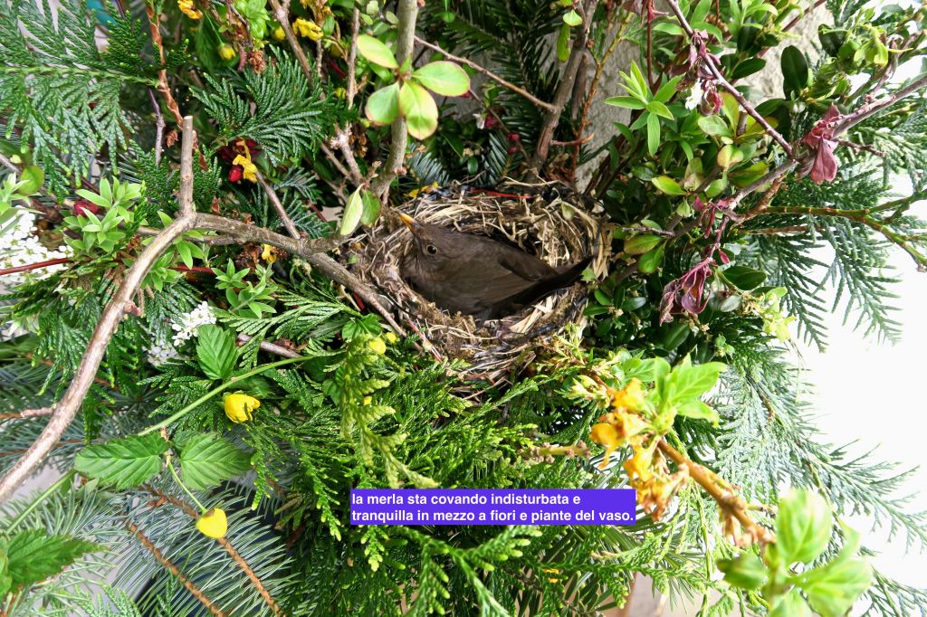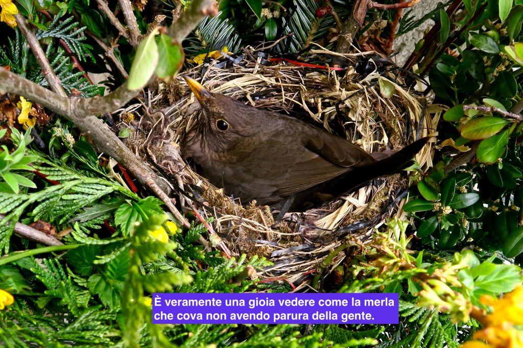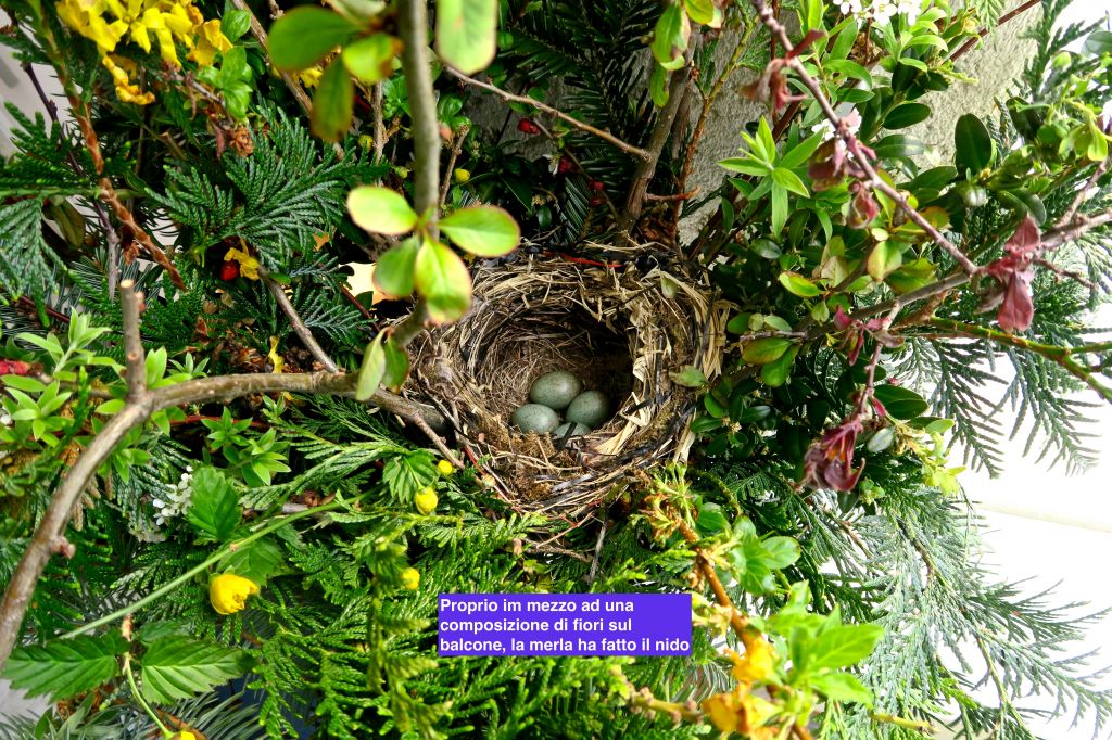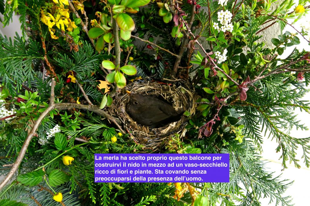 Una merla ha fatto il nido in mezzo ad una composizione di fiori su di un balcone. È un’avventura straordinaria il vedere come gli uccelli hanno la capacita di intrecciare dei ramoscelli per preparare la casa della nascente prole.