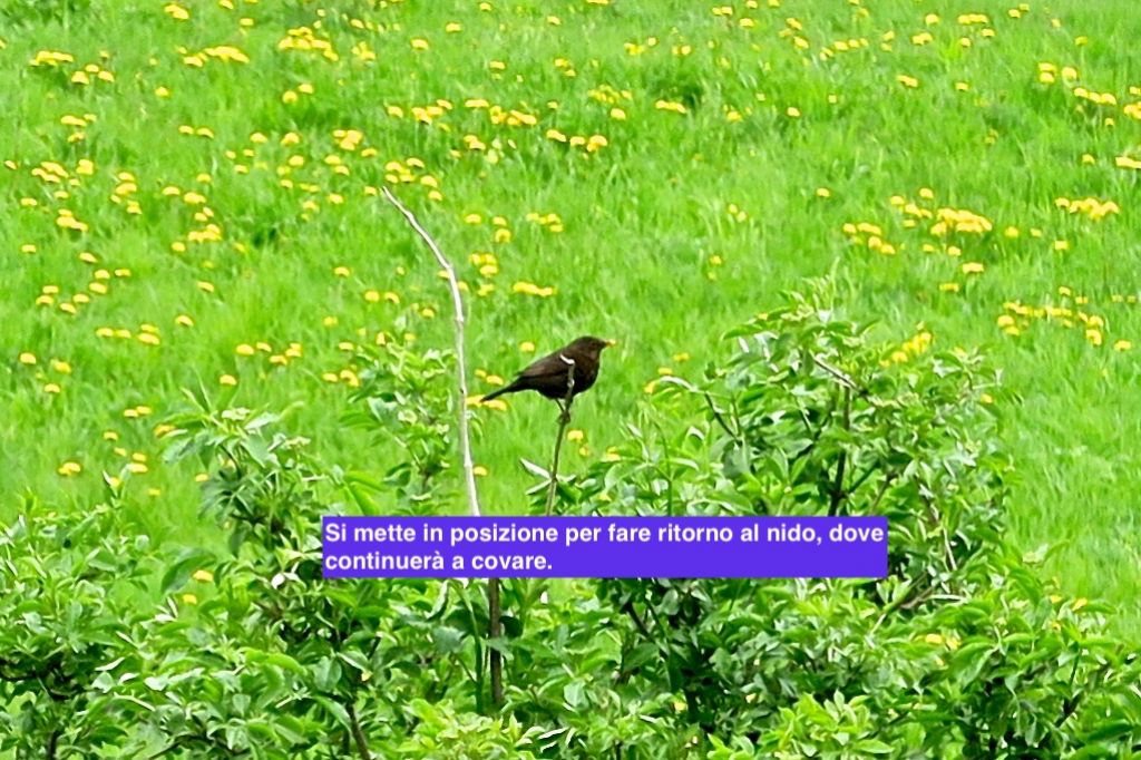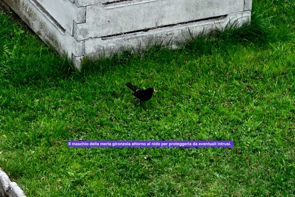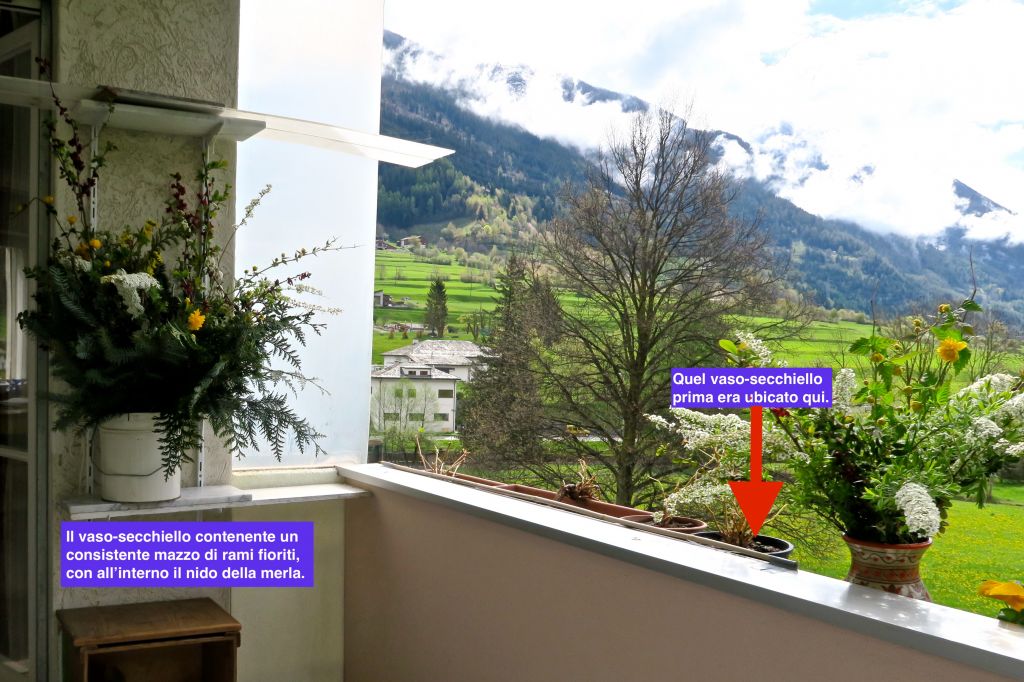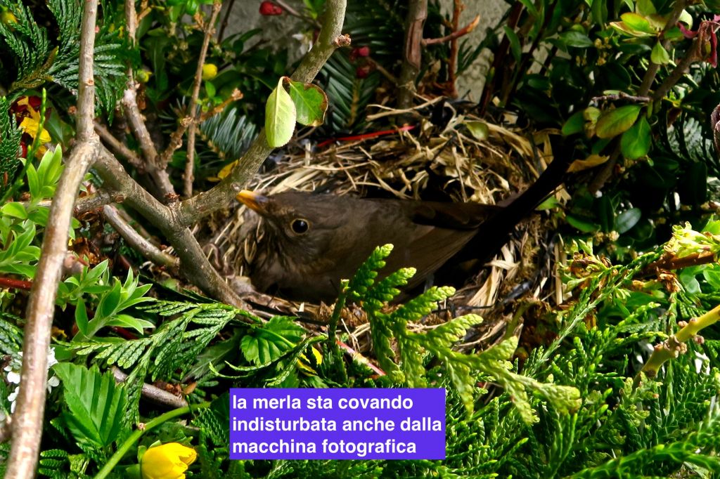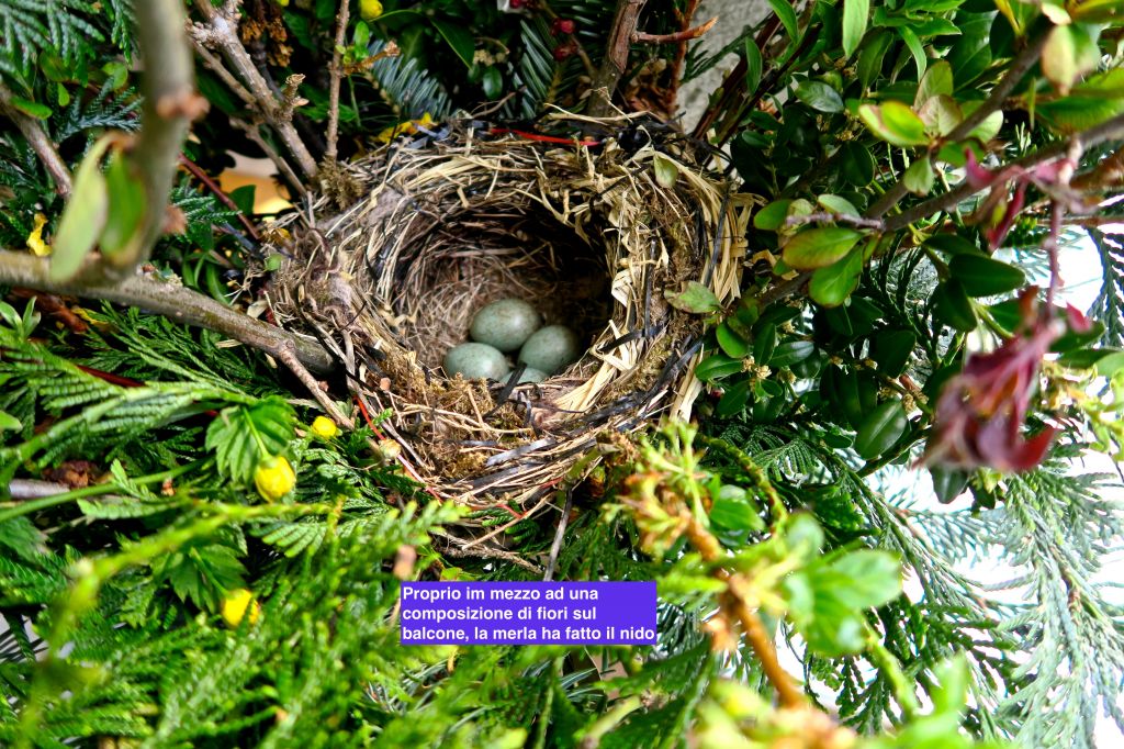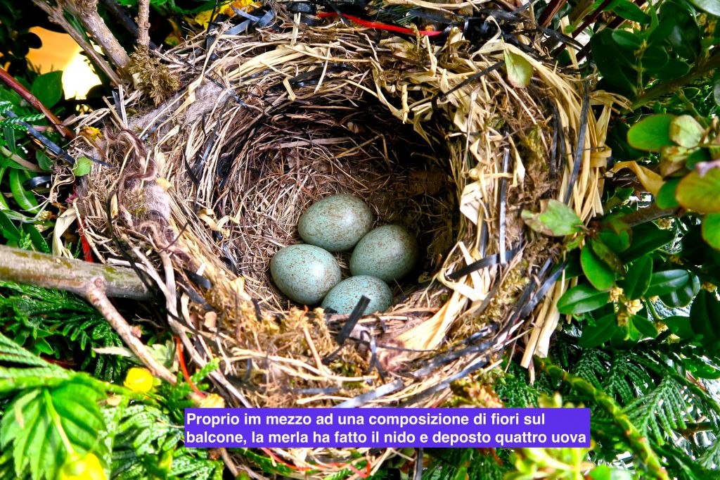 Una merla ha fatto il nido in mezzo ad una composizione di fiori su di un balcone. È un’avventura straordinaria il vedere come gli uccelli hanno la capacita di intrecciare dei ramoscelli per preparare la casa della nascente prole.