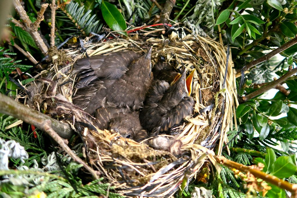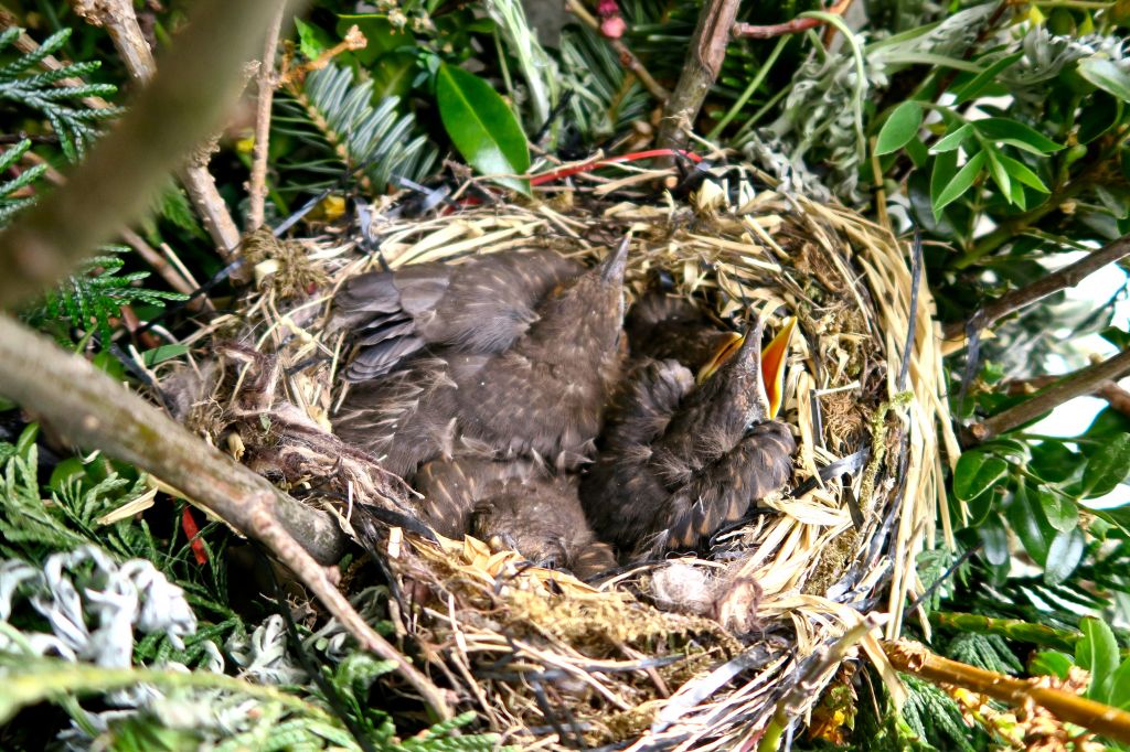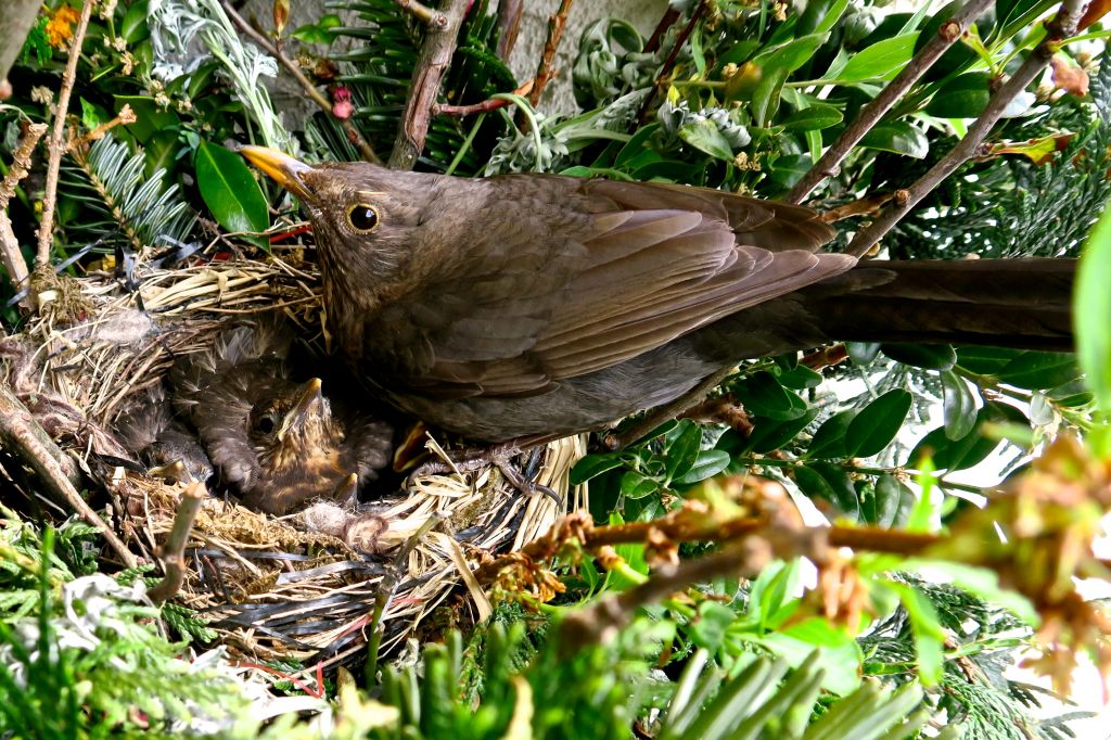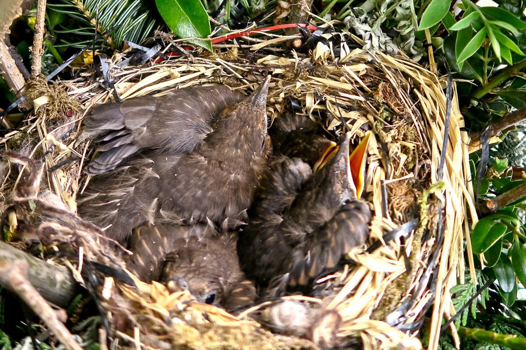 La deposizione delle quattro uova è avvenuta attorno al 26 aprile 2019 (vedi Grigione 9 maggio 2019, pagina 20 e nel sito https://www.ilgrigioneitaliano.ch/articoli/attualita/1935-un-avvenimento-straordinario-della-natura). Dopodiché la merla li ha covati con amore. Non si scomponeva e non si muoveva per nessuna ragione dal suo nido, nemmeno quando Felice gli parlava sommessamente. Quindici giorni dopo, sabato 11 maggio 2019, le uova si sono schiuse e sono usciti i piccolissimi merlini, ancora completamente ciechi e nudi, privi di penne e piume, che pian piano hanno incominciato a crescere su tutto il corpicino. Ma da subito hanno iniziato a tenere la bocca aperta in aspettativa di cibo. Infatti già dal primo momento è iniziato l’imboccamento dei piccoli, sia da parte della merla ma questa volta anche dal merlo. Infatti durante la cova il merlo non si è mai interessato del nido. Girava unicamente nei paraggi alfine di proteggere la cova da eventuali intrusi. Invece, allorquando sono nati i merlini, anche il merlo contribuisce a portare cibo e imboccarli. Però arriva velocemente, imbocca e poi se ne scappa via subito. Infatti ha un atteggiamento più selvatico rispetto alla merla. Da notare che in genere i merli sono monogami per tutta la vita.