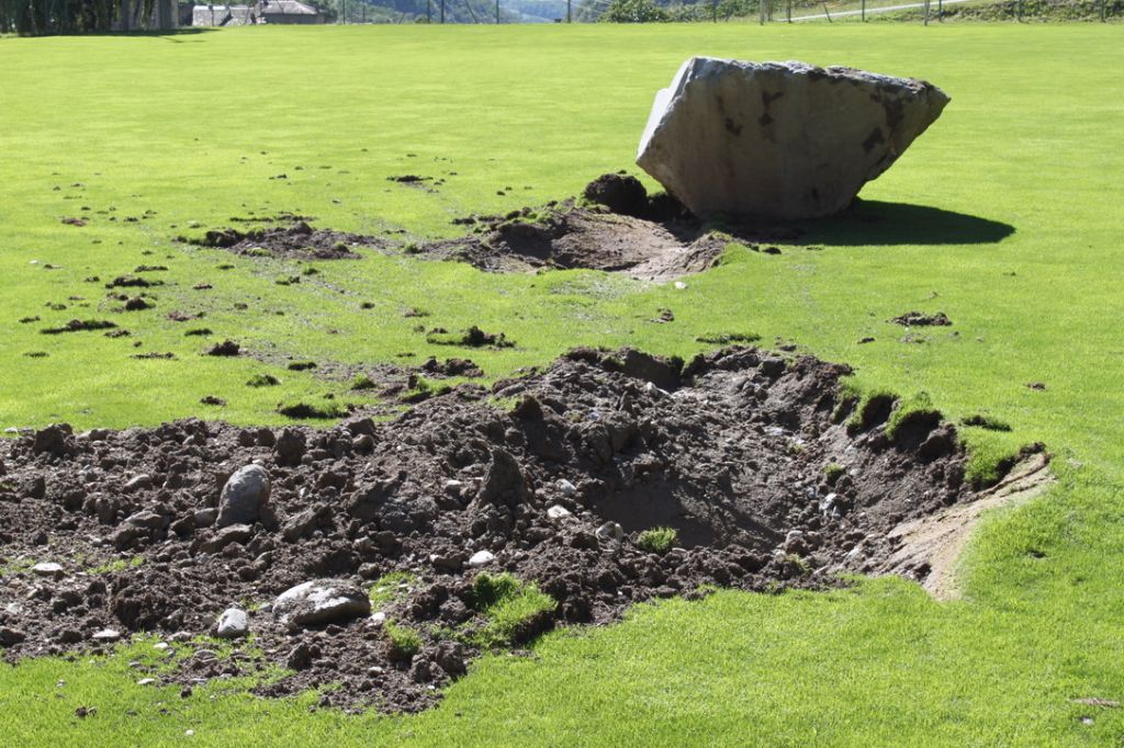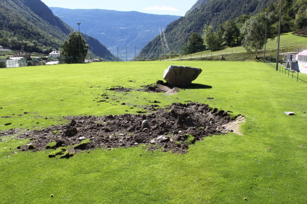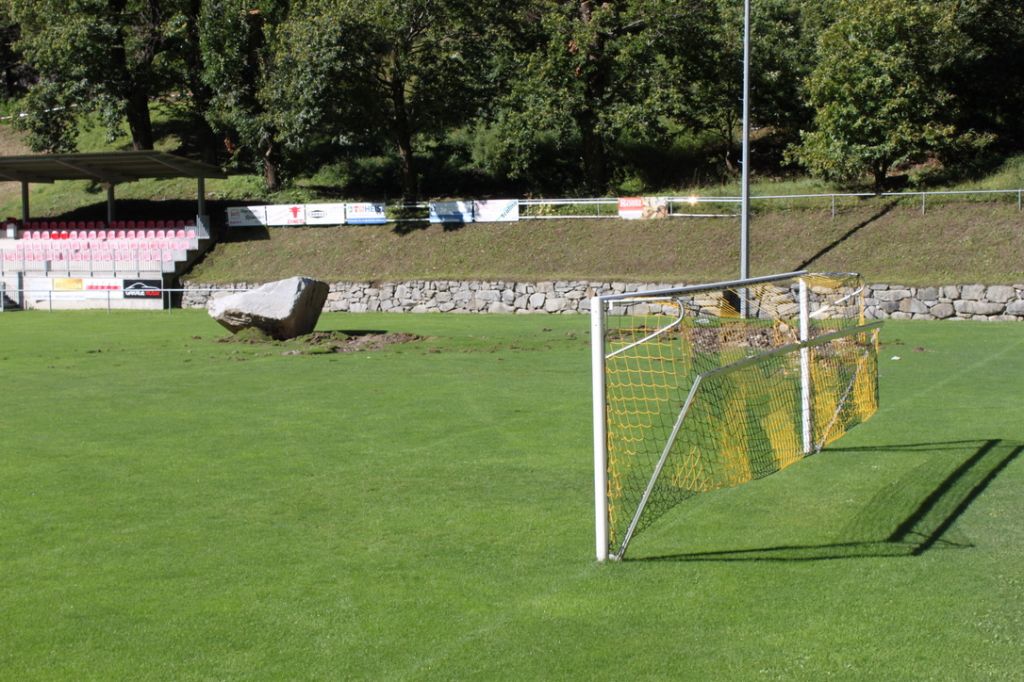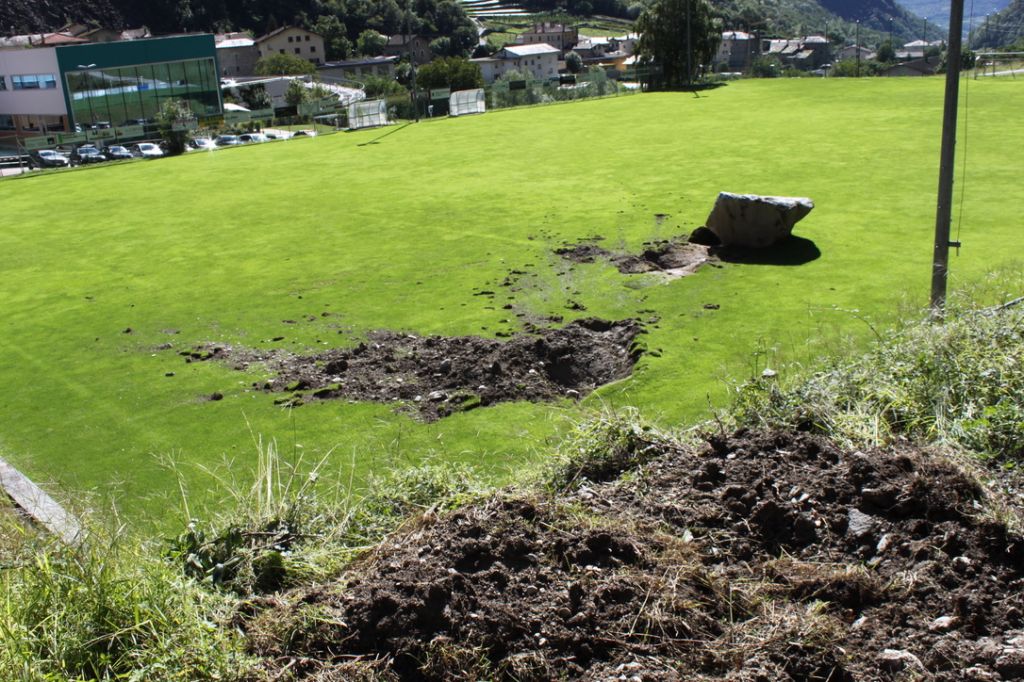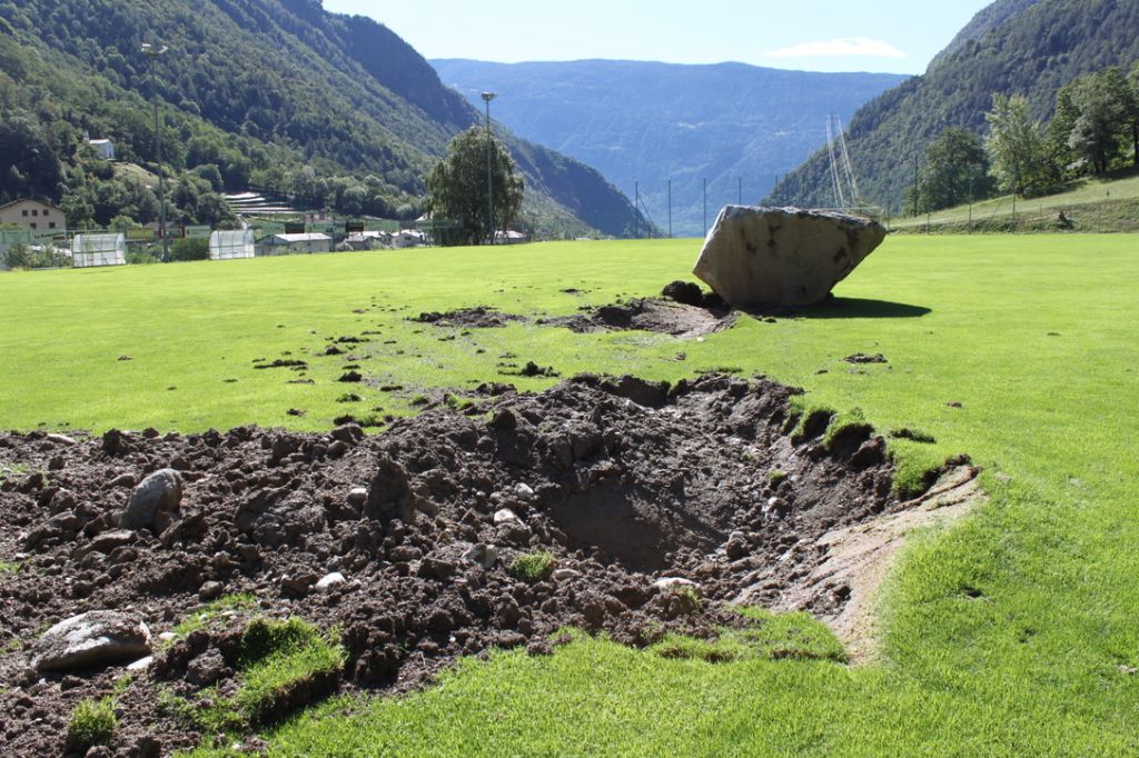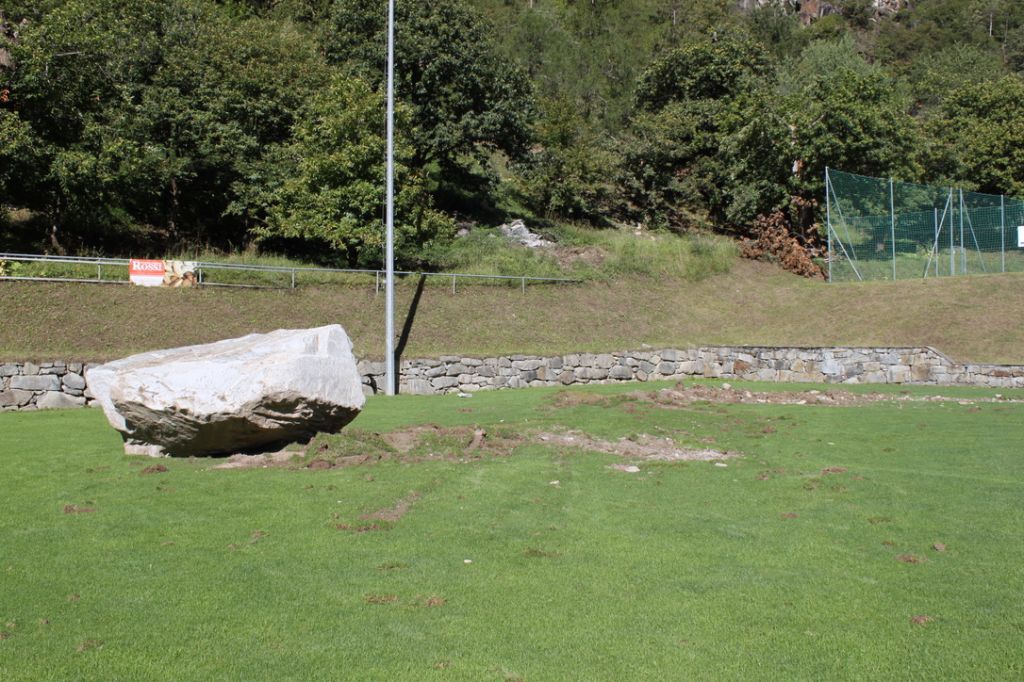 Nella notte tra sabato e domenica, un enorme masso è precipitato sul campo da calcio ai Casai di Campascio (Brusio), sfondando il terreno. Causa le forti precipitazioni di questi giorni, il masso si è staccato dalla parete rocciosa scivolando rovinosamente a terra. Superato il vallo di protezione, il masso è finito direttamente sul campo da calcio. Un secondo blocco, invece, si è schiantato direttamente contro la parete in legno della buvette della Valposchiavo Calcio, collocata accanto al campo sportivo. "Al momento è difficile quantificare i danni - risponde il sindaco di Brusio, Arturo Plozza - sarà un discorso da chiarire nei prossimi giorni con gli esperti delle assicurazioni. Al momento, il campo da calcio ai Casai, resta chiuso per i dovuti accertamenti relativi la sicurezza. In sessant'anni, è la prima volta che succede, non ho mai visto un masso cadere su questo campo da calcio".