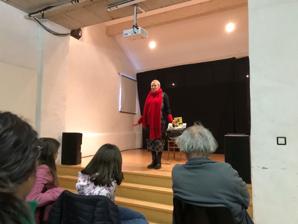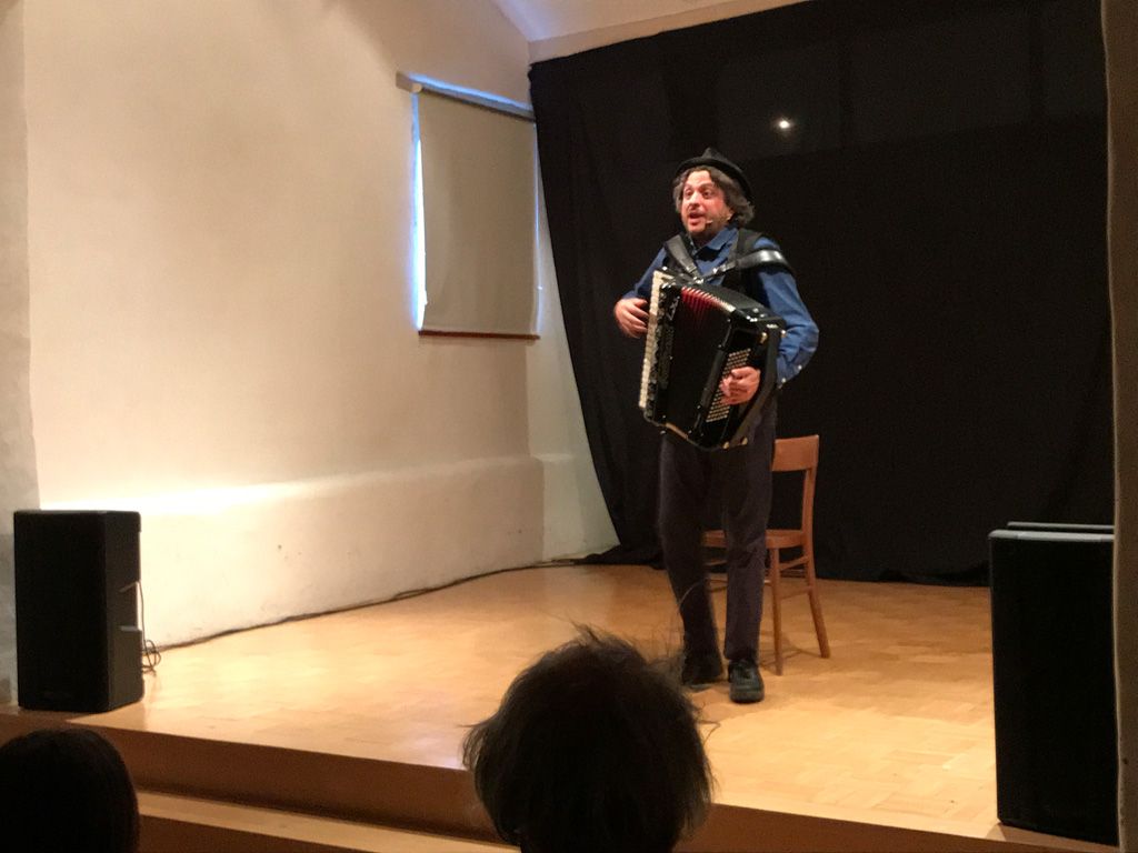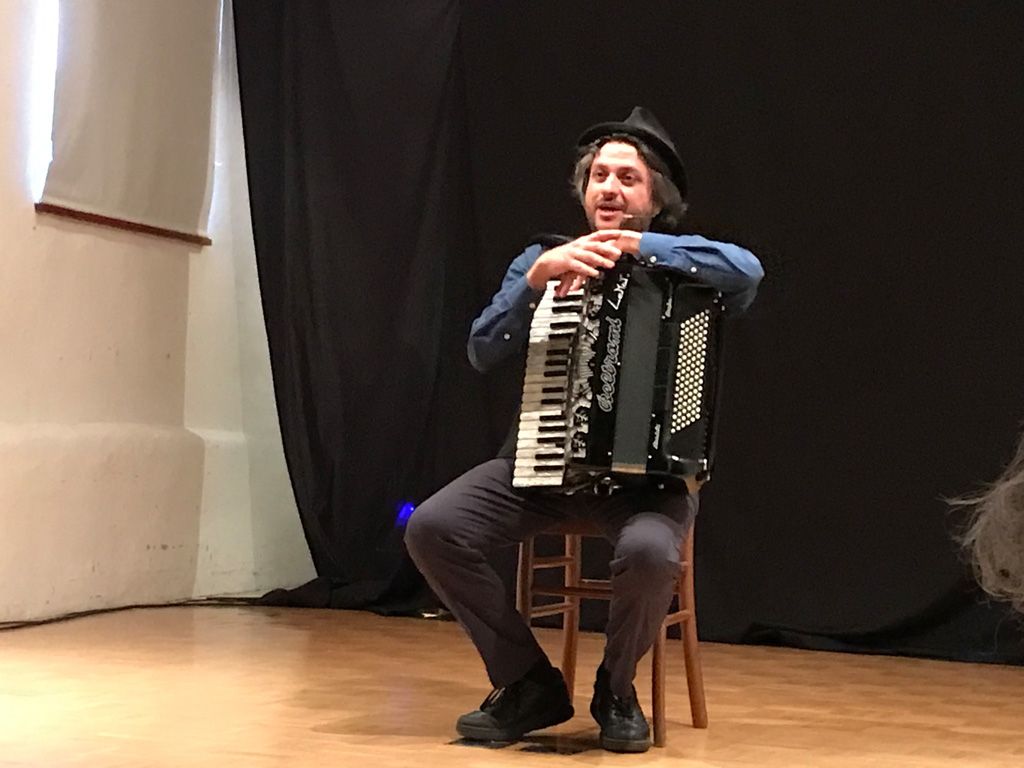 Lo spettacolo si è aperto con la storia della talpa, per la quale ha chiamato in scena uno dopo l’altro diversi bambini e adulti a interpretare l’uccellino, il coniglio, la capra, il cavallo, la mucca, il maiale, figure centrali della storia, lui cantando e suonando la fisarmonica. E il pubblico entusiasta ha partecipato molto, molto attivamente. È seguita la storia cantata di Paolino Paoletto che non voleva mangiare le verdure, poi la storia della bambina Lisa che voleva proprio avere tutto, a scapito degli altri. E infine, insieme all’attento pubblico, ha inventato una storia che per concludere ha improvvisato in musica e rime baciate.