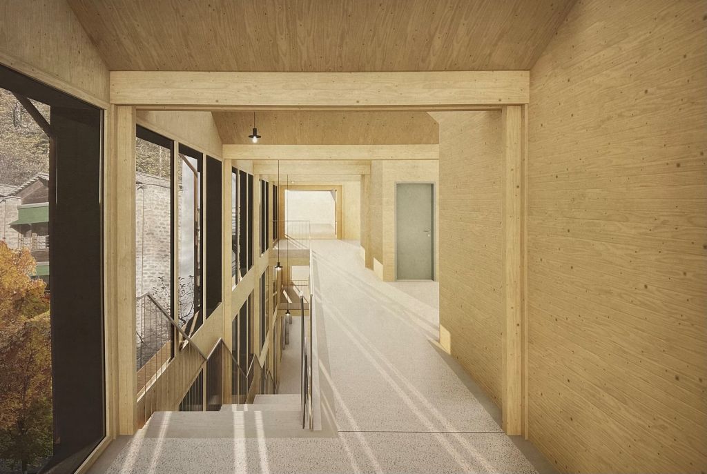 “Nonostante l'ampliamento dell'insieme, l'estensione sul lato del cortile migliora abilmente l'orientamento e la luminosità della struttura. La riorganizzazione delle destinazioni d'uso è stata ben scelta e si è ottenuta un'importante disaggregazione. Tutti gli ambienti principali e di accesso sono molto attraenti, illuminati naturalmente e beneficiano dell'imponente paesaggio montano”.