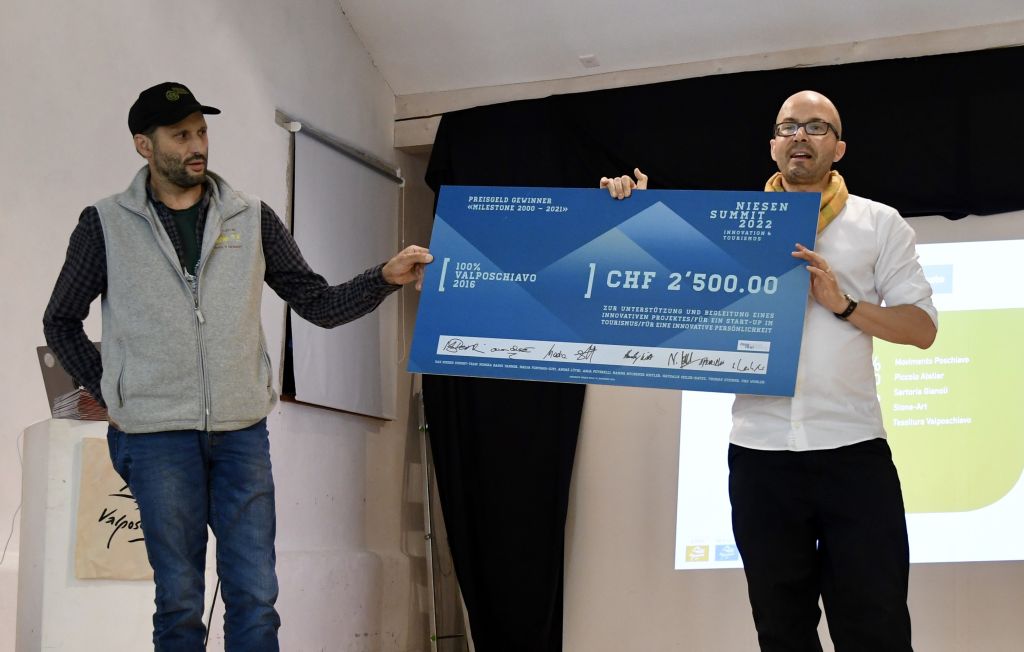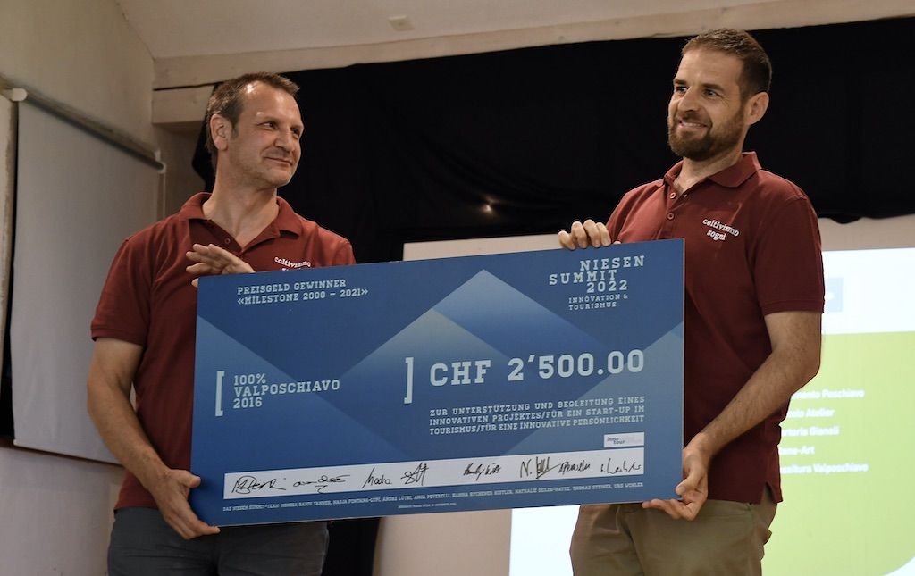 All'incontro dedicato al 100% Valposchiavo, tenutosi ieri nella sala polifunzionale di Casa Besta a Brusio, sono state assegnate le targhe ai partner e il premio Niesen Summit, assegnato al vincitore del concorso indetto da Valposchiavo Turismo. Il premio di 2'500 fr. è andato a Tiziano Iseppi, Nicolò Paganini e Marco Triacca, per il progetto innovativo della coltivazione degli ulivi a Campascio e la produzione d'olio d'oliva di montagna biologico.