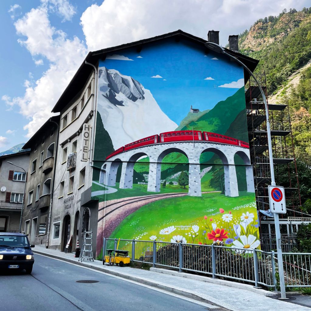 Luca Rancy ha realizzato quest'anno la sua opera a Campocologno su commissione privata. Facile da notare, visto che interessa un'intera parete di una casa, il murales rappresenta in particolare il Comune di Brusio con il viadotto, il treno rosso, San Romerio, l'abitato e le pietraie, ma anche l'intera Valposchiavo con la raffigurazione del ghiacciaio del Palü che svetta imponente.