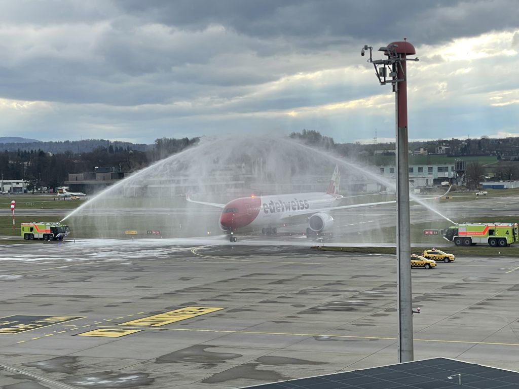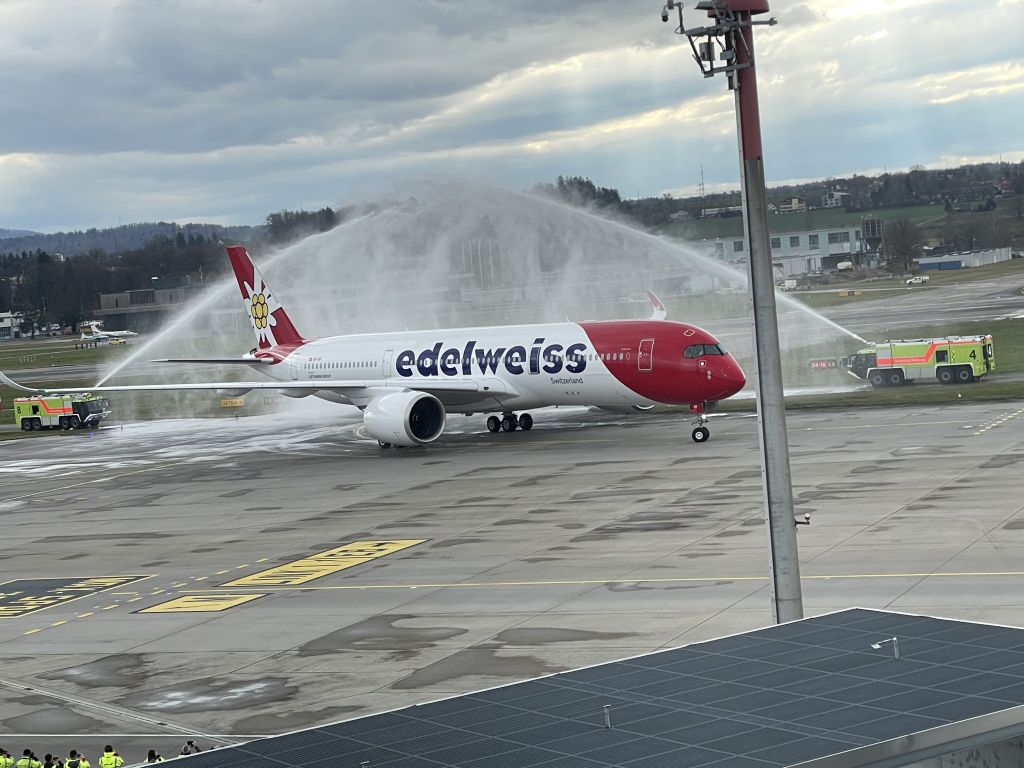Dalla terrazza panoramica 1.283 appassionati di aviazione hanno assistito al primo atterraggio dell'A350 con immatricolazione svizzera. La nuova ammiraglia Edelweiss, con la sigla HB-IHF, è decollata da Lourdes come volo WK5159, ha sorvolato il Cervino e le montagne bernesi prima di avvicinarsi, decollare, fare un giro di benvenuto attorno all'aeroporto e atterrare sulla pista 16. Dopo l'atterraggio, l'uccello meccanico, chiamato Piz Bernina, è stato accolto con il tradizionale "Saluto dell'acqua" da due mezzi dei vigili del fuoco e rullato fino allo stand, dove circa 100 dipendenti e ospiti Edelweiss hanno ricevuto cerimoniosamente l'aereo.