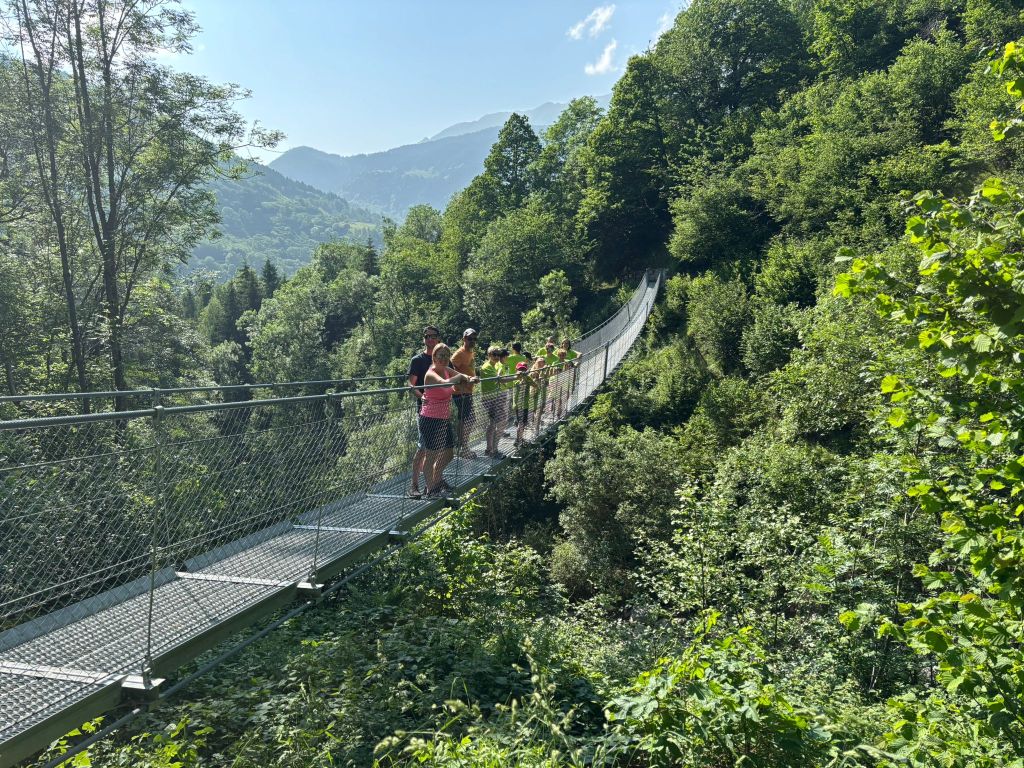 Arriviamo in campeggio e arriva la parte più noiosa per me, ovvero montare le tende per dormire. Per fortuna ci sono i genitori a farlo per noi 😊. Non hanno quasi fatto in tempo a finire di montarle che ha ricominciato a piovere. Per fortuna, per cena, avevano riservato dei tavoli in un ristorante nelle vicinanze e abbiamo gustato un’ottima pizza all’asciutto. Passa la notte e noi bambini aspettiamo solo una cosa: fare il bagno in piscina!! Un’acqua limpida azzurra e cristallina. Dopo svariati tentativi otteniamo l’ok dei genitori e ci tuffiamo. L’acqua è abbastanza fredda e non tutti resistono ed escono quasi subito. Dopo esserci asciugati al sole sono arrivati Valentina e Nicolao che con grande pazienza ci hanno lasciato provare a scalare nella grande parete d’arrampicata del campeggio. Ci siamo entusiasmati molto, con un’po' di paura iniziale abbiamo continuato a scalare e a buttarci nel vuoto. Dopo un’ottima grigliata in compagnia e tante canzoni accompagnate dalla fisarmonica di Zio Dino ad alcuni genitori è venuta una brillante idea, ovvero di andare a vedere un ponte tibetano. La voglia non era delle più grandi ma mi è toccato andare.