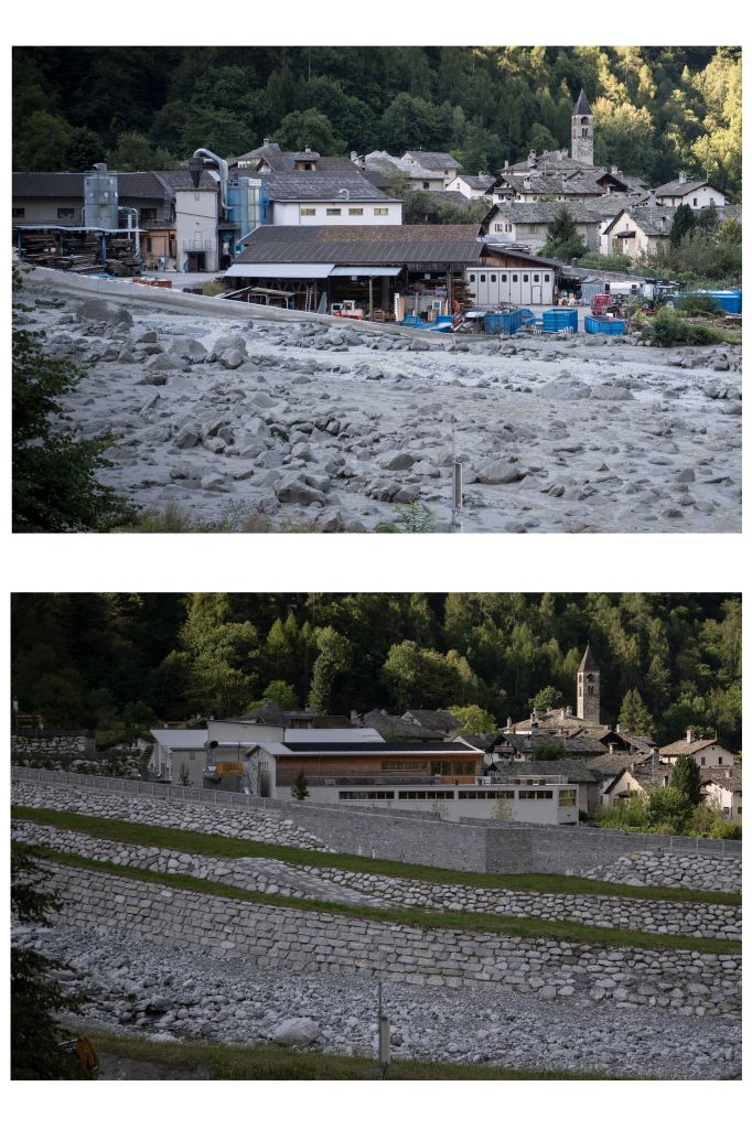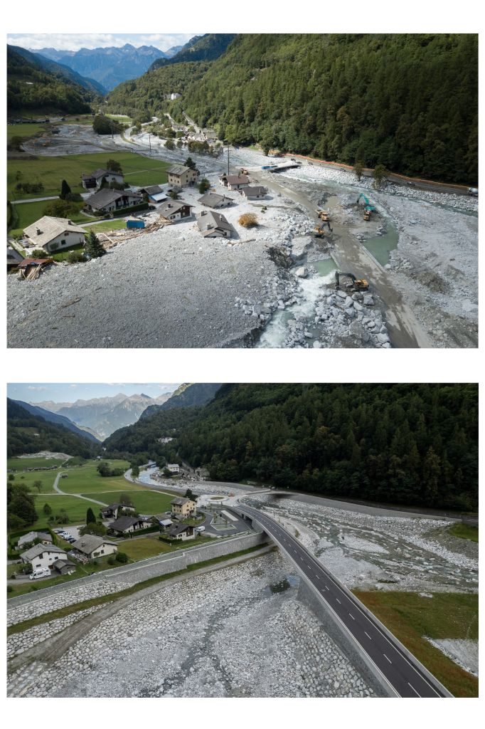 Nelle prima due immagini il confronto paesaggistico appena dopo la frana nel 2017 e della situazione attuale a Bondo.