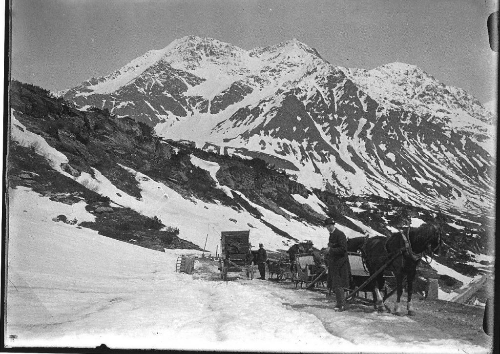 Un tale impegno, non sempre gradito in particolare per quanto riguardava la riscossione di dazi e pedaggi che diventarono prerogativa del Cantone, portò comunque alla nascita di un bene economico importante e di attività legate alla strada, ai commerci ed al passaggio a carattere turistico. A tale proposito, la mostra presenta una serie di cartine topografiche che illustrano i cambiamenti dei nuclei abitati lungo la via nel tratto mesolcinese, dando una visione chiara di quanto i villaggi si siano sviluppati in funzione delle nuove opportunità offerte da una viabilità di connessione transalpina. Interessante anche la vetrina dedicata al viaggio dell’Imperatrice di Russia che nel 1856 passò dalla Mesolcina con il suo convoglio di 18 veicoli, 107 cavalli e 33 postiglioni per recarsi in Costa Azzurra, occupando personale e strutture locali per compensi superiori ai comuni di almeno tre volte. Lungo la strada carrozzabile nacquero diverse locande e quelle già esistenti, come l’Osteria Croce Bianca di Soazza la cui insegna originale è esposta all’ingresso dell’esposizione di Palazzo Viscardi, vissero momenti di gran beneficio. Tra i documenti presentati presso il Museo Moesano, molto istruttivi anche gli orari delle diligenze, riportate da una copia dell’almanacco Il Mesolcinese del 1835, che misuravano le distanze in ore, ottavi e quarti di ore, ignorando i chilometri, che fecero la loro apparizione soltanto con l’avvento dell’automobile, insieme alle segnalazioni in pietra – pietre chilometriche – poste ogni 500 metri e indicanti la distanza da Coira. Per spostarsi da Coira a Bellinzona un viaggiatore della diligenza doveva calcolare «soltanto» 25 ore, contro i due o tre giorni, salvo imprevisti, che andavano messi in conto prima della strada carrozzabile. In caso di neve i tempi potevano anche essere ridotti – al contrario di quanto siamo abituati a pensare noi automobilisti moderni – in quanto le slitte che si alternavano alla diligenza per il valico del Passo, scivolavano agilmente sul manto nevoso e potevano usufruire di percorsi al riparo dal rischio valanghe ed a volte anche più brevi. Il Passo era aperto tutto l’anno ed il transito era regolare: fino a quando, all’inizio degli anni Quaranta, la predominanza di macchine e autocarri ha creato le condizioni per interrompere il servizio slitta. Da allora, fino all’apertura del tunnel autostradale del San Bernardino (1º dicembre 1967), il Moesano è rimasto isolato dal resto del Cantone per circa sei mesi all’anno. Un esemplare di slitta donata al MuMo dalla famiglia a Marca di Mesocco, è esposta in mostra, insieme ad una preziosa fotografia (proveniente dall’archivio a Marca) che rappresenta il momento del cambio dalla diligenza alla slitta, nei pressi della Cà di Mucia, lungo la strada del passo (ca. 1920-1930).