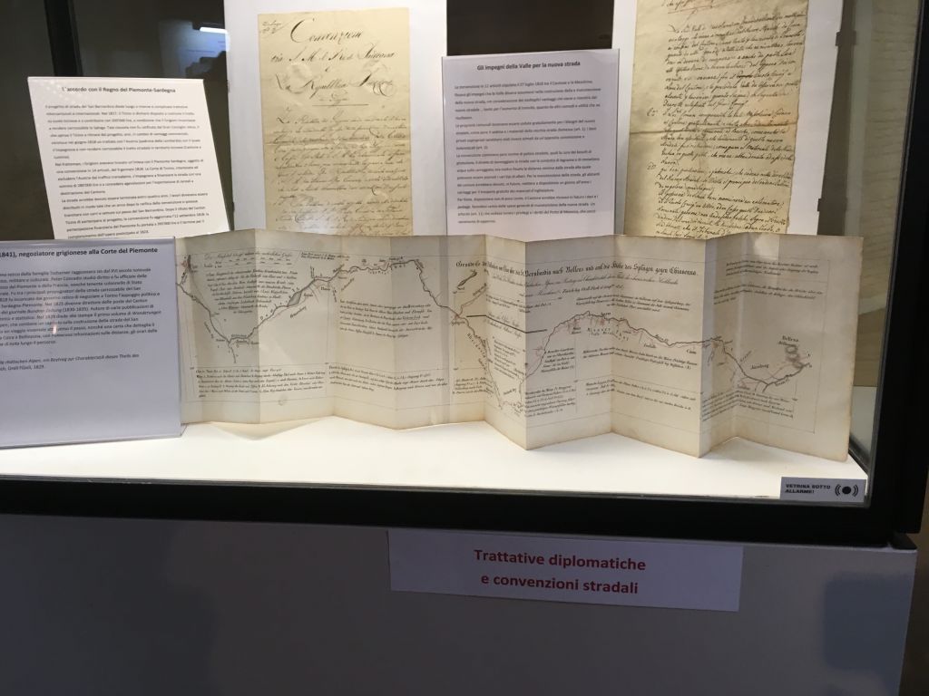 Peter Conradin von Tscharner, negoziatore grigionese presso la corte del Regno di Piemonte-Sardegna, fu colui che riuscì a concretizzare un accordo di collaborazione economica con i piemontesi. Essi contribuirono alla realizzazione della carrozzabile ottenendo un comodo accesso al nord delle Alpi per il trasporto delle merci provenienti dal porto di Genova. L’esposizione presso la sede di San Vittore del Museo Moesano presenta i documenti relativi a tale accordo con una breve ma chiara descrizione, anche delle controverse trattative avvenute con il vicino Cantone Ticino. Dopo una iniziale adesione al progetto – vincolata a una clausola che avrebbe impegnato i grigionesi a non rendere carrozzabile lo Spluga e che venne rifiutata dal Gran Consiglio retico – il governo ticinese si ritirò e giunse addirittura a firmare un accordo con l’Austria (padrona della Lombardia e antagonista economica del Piemonte) che lo impegnava a non rendere carrozzabile il tratto Castione-Lumino in cambio di favori commerciali. In tutto questo la posizione del progettista e appaltatore, ma anche membro del Governo Ticinese, Giulio Pocobelli, risulta un po’ controversa. Di fatto le iniziali divergenze di interesse si appianarono nel 1824 quando l’Austria, consapevole dell’importanza commerciale e politica dell’opera viaria realizzata dai grigionesi, acconsentì alla sistemazione del tratto stradale ticinese in cambio di alcuni allargamenti del passaggio stradale sullo Spluga. Tra i documenti esposti nelle vetrine dell’esposizione, non manca la parte dedicata agli impegni che la Valle Mesolcina si assumeva nei confronti dell’opera stradale: intanto le proprietà comunali ed il sedime della vecchia strada dovevano essere cedute gratuitamente, mentre le proprietà private espropriate sarebbero state risarcite secondo la valutazione di una commissione ad hoc. Oltre a questo, gli abitanti della valle dovevano mettere a disposizione mensilmente mezzi di trasporto per la ghiaia necessaria a sistemare il fondo stradale e avevano l’obbligo di rispettare le regole fissate riguardo alla distanza di piantumazione dal suolo stradale, alla proibizione di immettervi acqua e di trascinare oggetti che potessero rovinarne la compattezza. Ovviamente, anche la manutenzione dei boschi e degli argini della strada erano a cura dei comuni che impiegarono diversi stradini, il cui compito era anche quello di controllare il rispetto delle regole succitate.