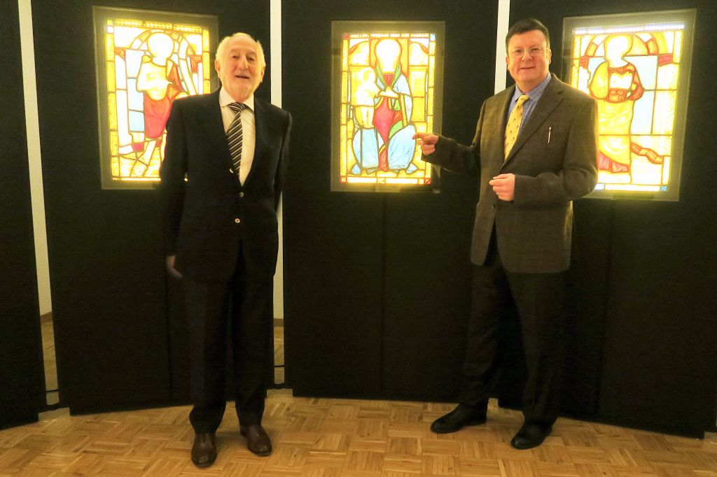 NELLA FOTO SOPRA: Il direttore di Casa Console Guido Lardi (sinistra) e il dott. Gian Casper Bott, storico dell’arte, davanti alle vecchie vetrate della chiesa di San Vittore Mauro a Poschiavo. A loro va un grande riconoscimento per come hanno egregiamente allestito la Mostra temporanea.