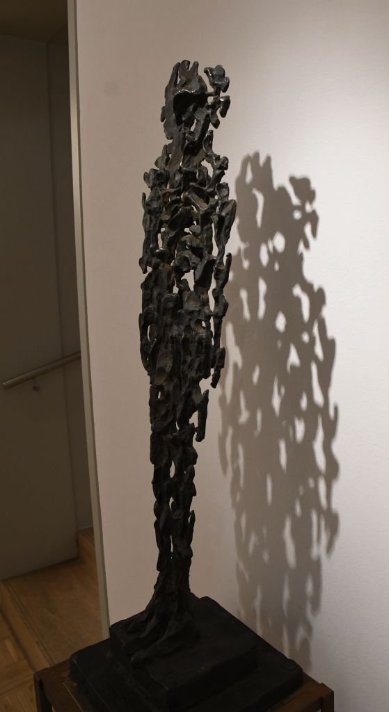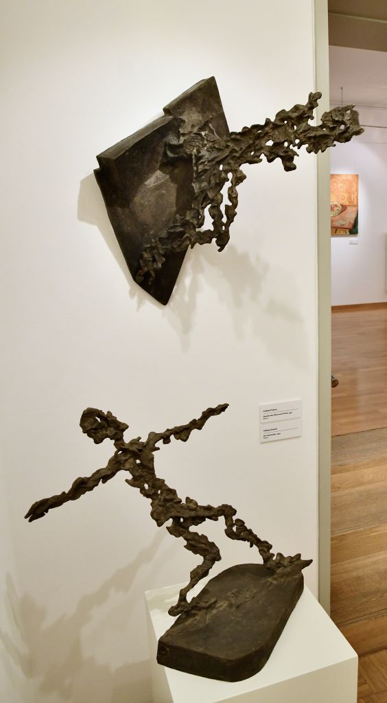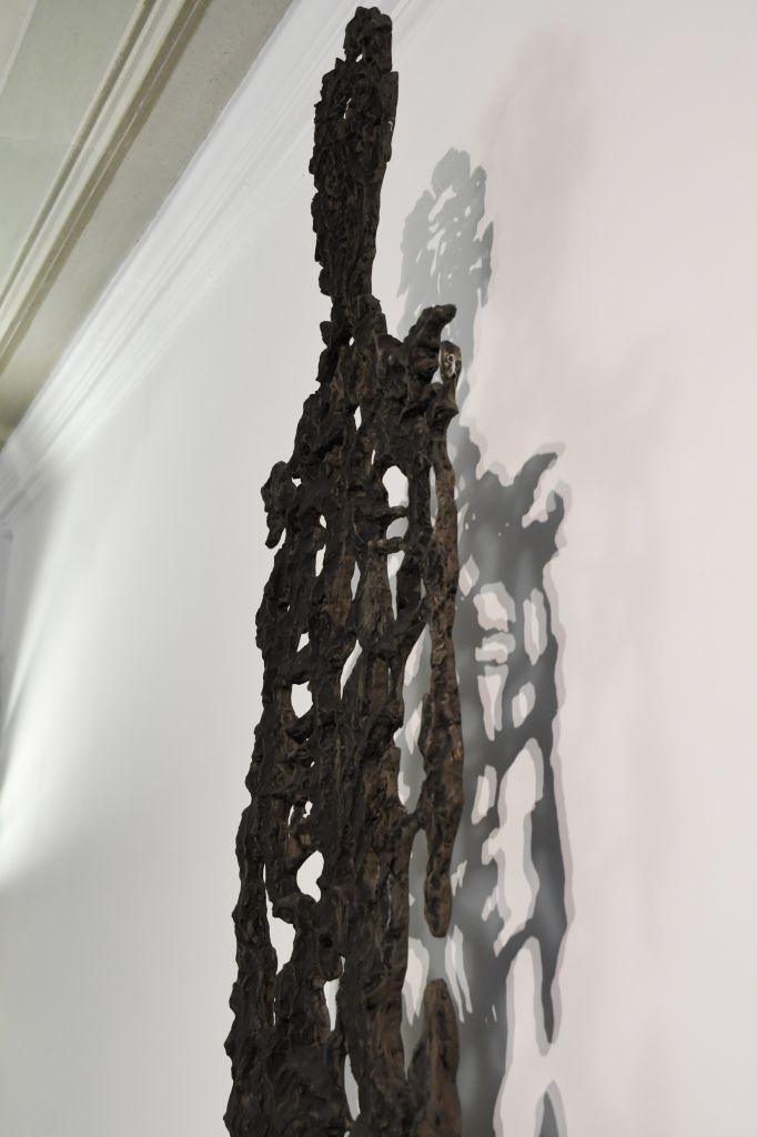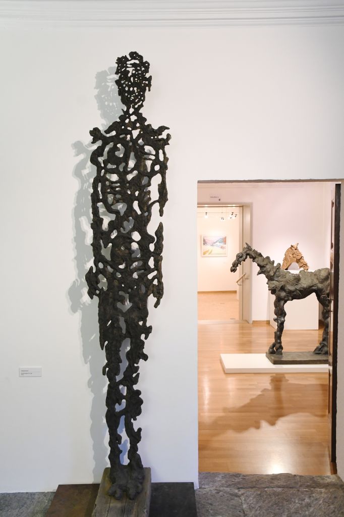 Anche nelle sculture frastagliate del figlio Giuliano Pedretti si possono intravedere crinali e vallate, come nella testa di cavallo esposta ad altezza pavimento, che pare la vetta di una montagna. Ed elementi del paesaggio ritornano anche nelle sculture verticali, forate e frastagliate, che paiono in dissoluzione, come Der grosse Mann, alto 2.70 m, che aspetta il visitatore sulla soglia dei locali espositivi. Quest’uomo scarnificato sembra formato da terrenzlas che in romancio sta a significare la formazione di chiazze di terra e neve nel periodo dello scioglimento del manto nevoso, caratteristica ben visibile nei pascoli e pendii alpini in primavera. Da ammirare il gioco d’ombre e luci sulla parte dietro alla scultura bronzea (questo vale anche per altre opere).