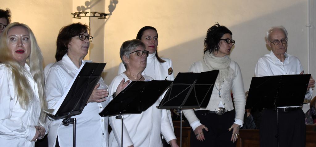 Le due formazioni si sono dapprima esibite separatamente, con il proprio peculiare repertorio ( la canzone italiana con incursioni nel folklore bulgaro per Doppiavì, la tradizione americana e la musica africana per Swing Singers) per poi riunirsi nell’esecuzione di due celeberrimi e graditissimi brani: l’emozionante “Amazing Grace”e il classico brano corale pop, che unisce musica e solidarietà, “We are the world”. Manuela Zampatti ha saputo trascinare con simpatia il pubblico che, torce accese e ugole aperte, ha partecipato all’ultimo brano cantando: “Siamo il mondo, siamo i bambini”.