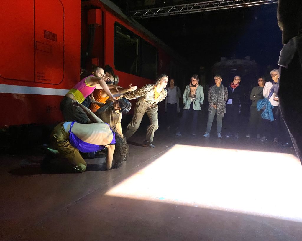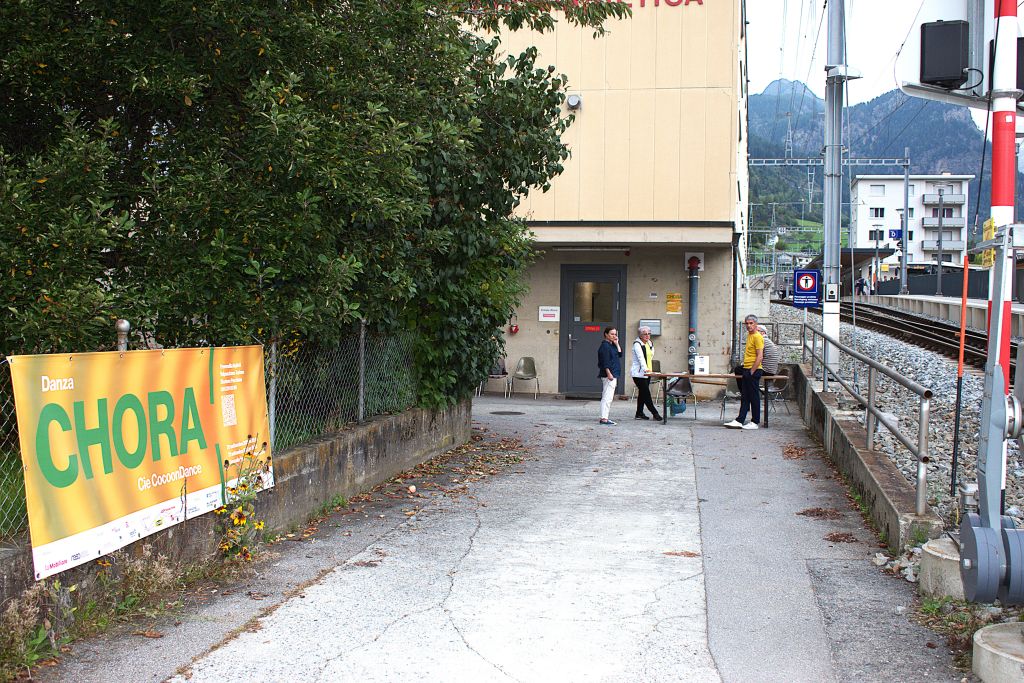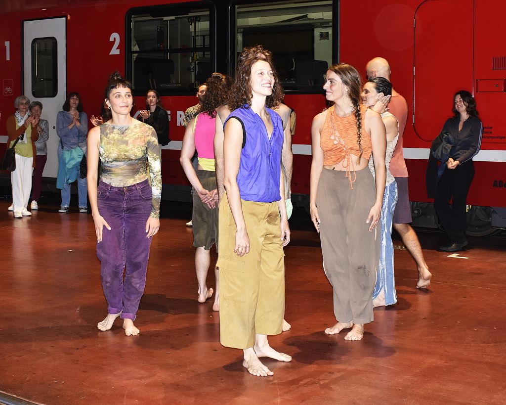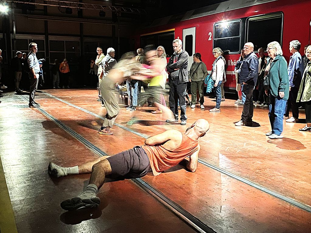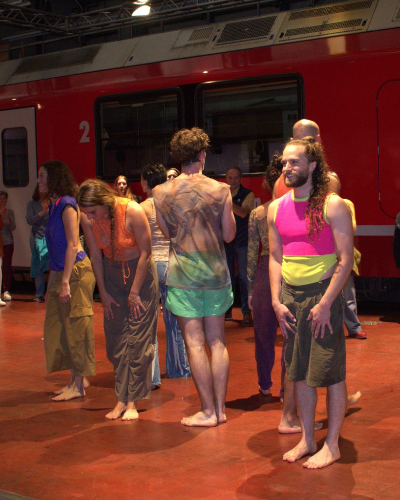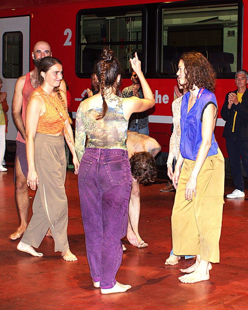 In Chora, installazione sonora e spaziale con un suggestivo gioco di luci, supportato da un’imponente attrezzatura tecnica, della coreografa Rafaële Giovanola per CocoonDance, andata in scena sabato e domenica al Deposito Ferroviario, grazie all’ incredibile impegno di Paola Gianoli con la sua riverbero.ch, i sette danzatori occupano lo spazio in modo creativo e fluido, provocando il movimento del pubblico che, in questo modo, si sposta in funzione dello spazio necessario ai danzatori, diventando a sua volta un elemento fluido. Perfetto, per questo scopo, il Deposito che con il suo aspetto industriale, il suo vagone rosso di lato e dotato di un grande spazio, appunto, da inventare, perché finalizzato ad altro, diventa uno straordinario scenario creato dall’ interazione fra le persone che lo abitano e lo spazio stesso.