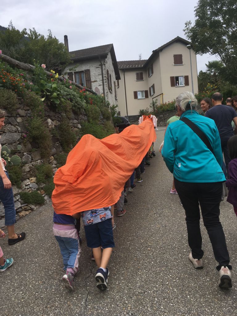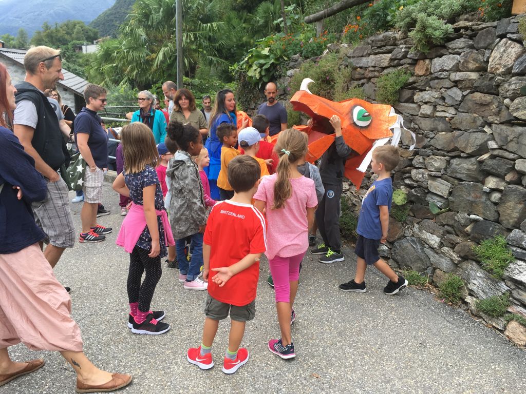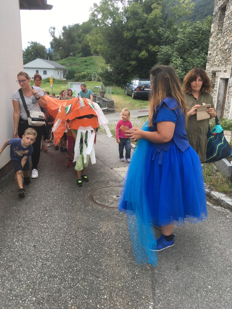 I ragazzi, provenienti da Monticello e San Vittore, Lumino, Grono e Roveredo, sono stati invitati a collaborare nel dar vita ad un “drago dei racconti” che ha seguito il carillon e il canto della fatina blu, Vicky de Stephanis, in un percorso a tappe animate. Dalla chiesa del villaggio, attorniato da vigneti e alberi da frutto, il gruppo di ragazzi, accompagnati da genitori e nonni, si è avviato verso l’antico lavatoio fatto da luoghi particolari. Il corteo ha effettuato delle piacevoli soste durante le quali ha potuto ascoltare ed assistere alle fantasiose messe in scena di racconti magici e avventure fiabesche, ambientate nel mondo rurale del nostro passato. C'era un contadino con una moglie un po’ tiranna che incontra un ranocchio-stregone, delle strane trecce sulle criniere di cavalli tranquilli, un cavaliere che ha bisogno dell’aiuto del drago per far fronte ai nemici e infine un gruppo di bambini che vengono tiranneggiati dalla strana sirena del lavatoio fino a che i loro stessi desideri non riescono a liberarli.