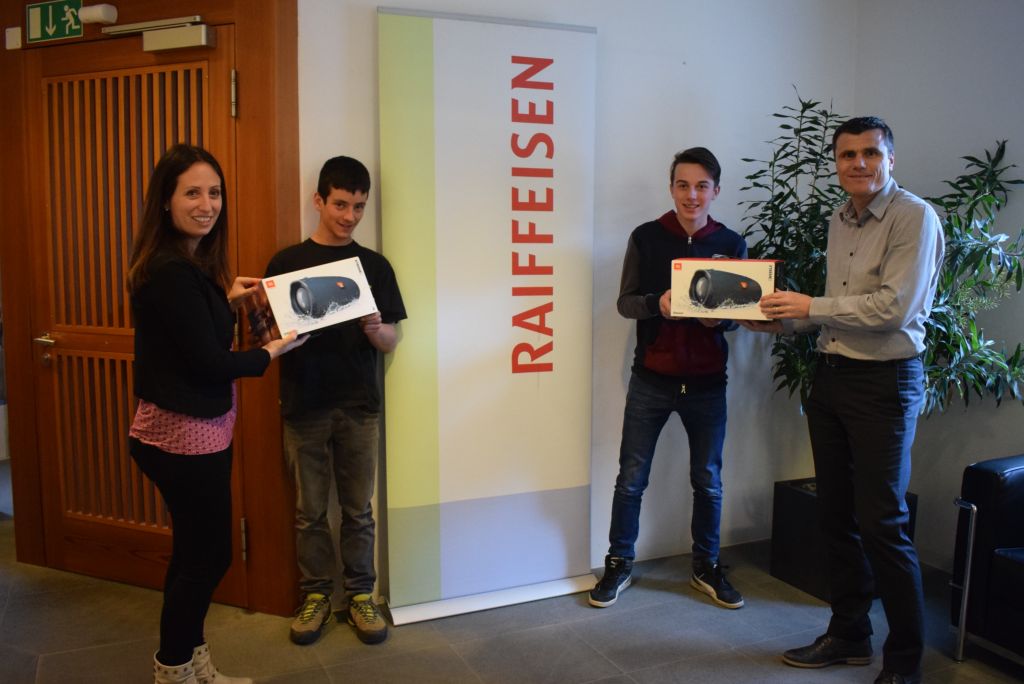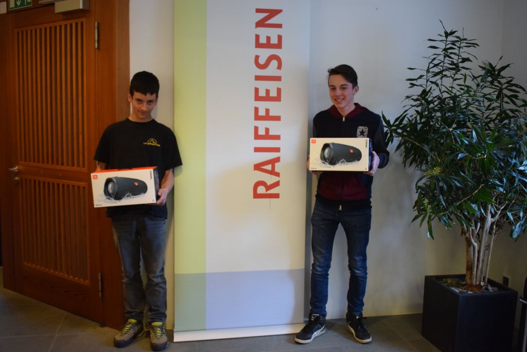 Ogni anno la Banca Raiffeisen Valposchiavo premia gli scolari delle terze superiori che aprono presso la loro filiale un conto gioventù per apprendistato o per studio. Quest’anno i fortunati vincitori di un piccolo box bluetooth sono stati Amedeo Pianta di Prada e Elia Beti di San Carlo.