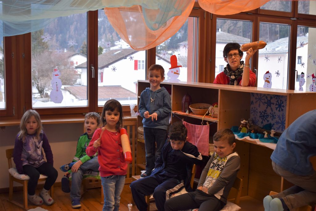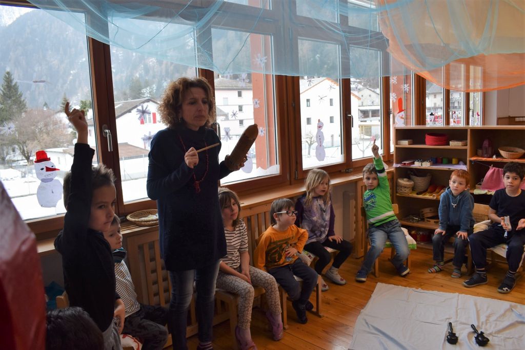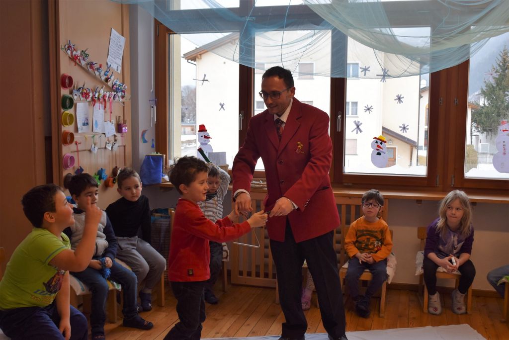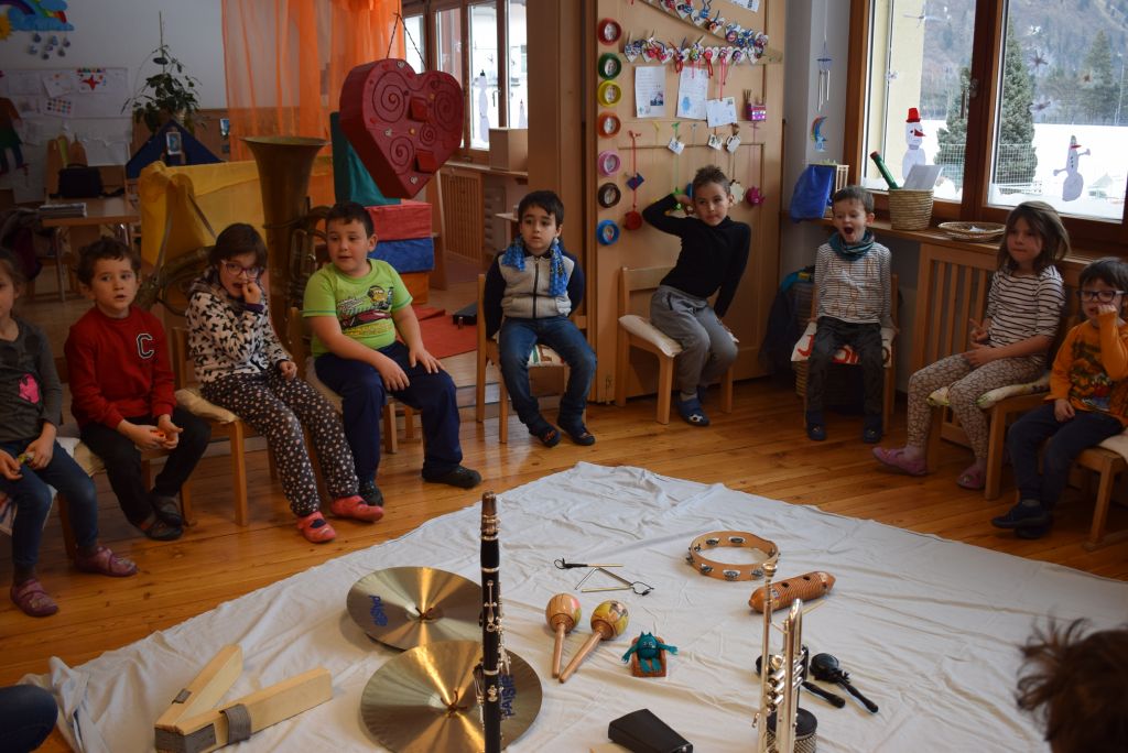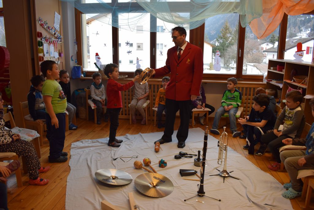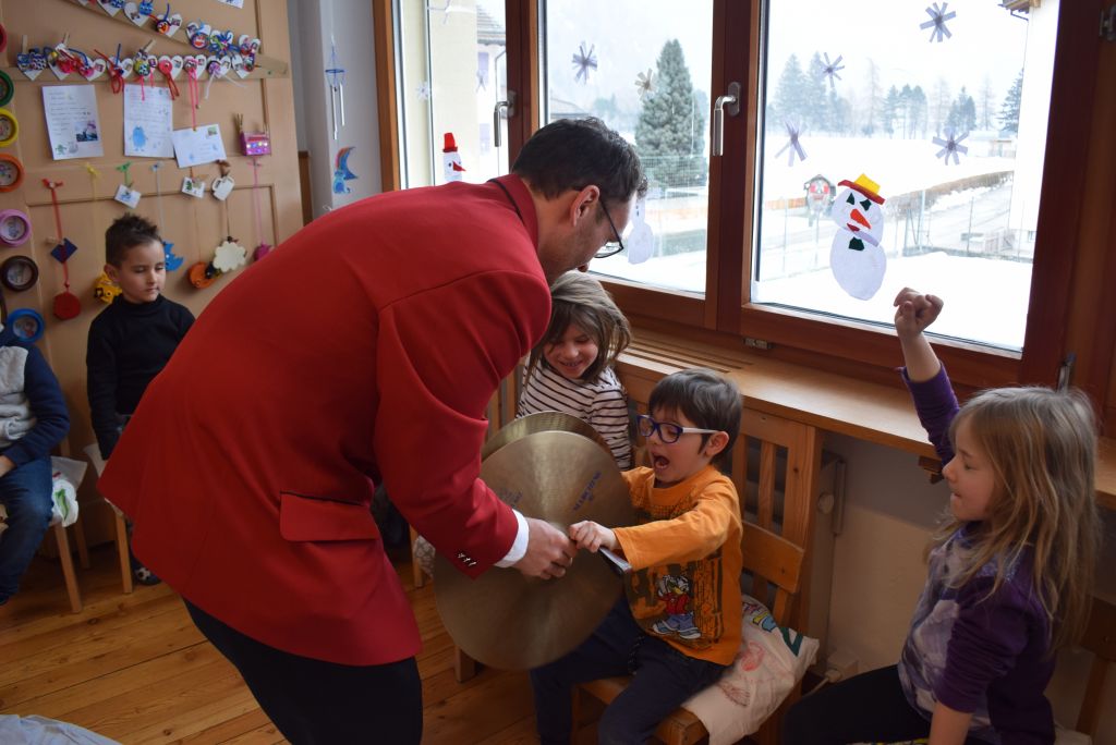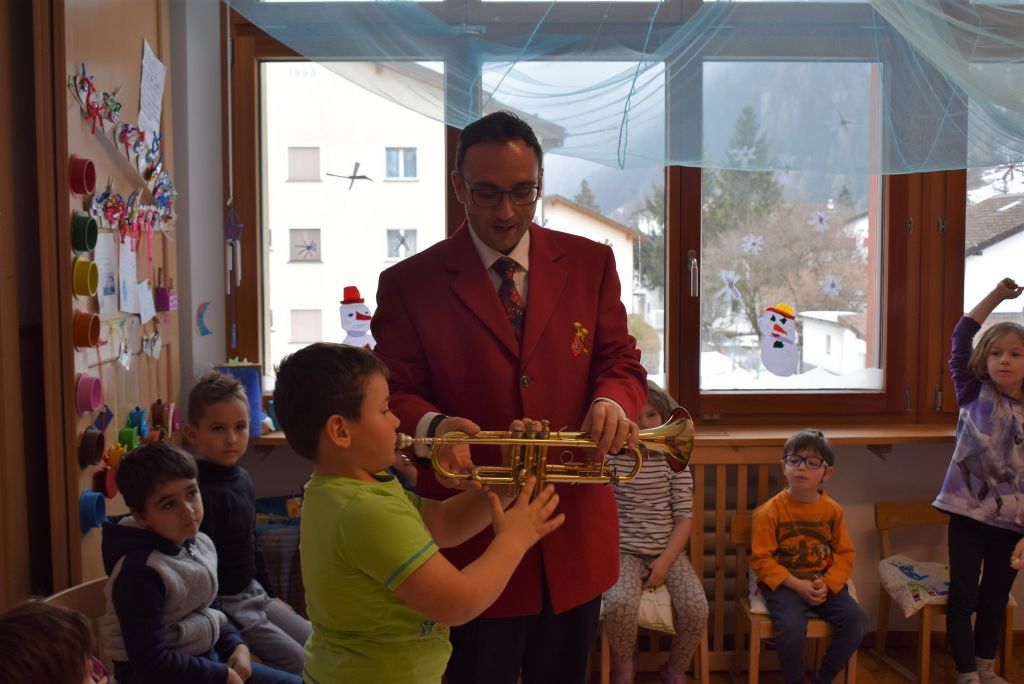 Tutti noi, grandi e piccini proviamo delle emozioni! La paura, la rabbia, la calma, la tristezza e la gioia sono dei sentimenti che si scatenano spesso dentro di noi e che per tanti motivi non sempre riusciamo a tenerli sotto controllo. I bambini della "Si di Le Prese" (sezione Luna dell’insegnante Silvana) dall'inizio dell’anno scolastico 2017/2018 grazie a dei piccoli mostri (pupazzi di stoffa colorati), hanno imparato a conoscere una alla volta le emozioni che sono racchiuse dentro il nostro cuore. Dopo le vacanze di Natale il mostro blu della tristezza è arrivato in piscina su una barchetta perché lui ha una certa affinità con l’acqua, ama il mare e la pioggia. Quando si sente tanto solo e triste, la musica riesce a farlo stare meglio; è un grande appassionato di strumenti musicali. In occasione del periodo di carnevale ha fatto ascoltare agli scölin “Il carnevale degli animali”, per questo motivo i bambini hanno deciso di travestirsi per il corteo di carnevale da leoni. Il presidente della Filarmonica Comunale Poschiavo Michele Zanetti, ha prestato per un periodo alcuni strumenti musicali (che non venivano più usati ed erano riposti in magazzino): una tromba, un basso tuba, un clarinetto e un euphonium (bel suono). Immaginatevi che gioia per gli scölin poter provare a suonare quegli strumenti! Ma la sorpresa più grande che l’insegnate Silvana ha riservato ai sui scölin, è stata la visita a sorpresa, venerdì pomeriggio 9 gennaio, di tre esperti d’eccezione in fatto di strumenti: il presidente della Filarmonica Comunale Poschiavo Michele Zanetti, la vice presidente Linda Cortesi-Lanfranchi e l’attuaria Laura Brändli-Costa.