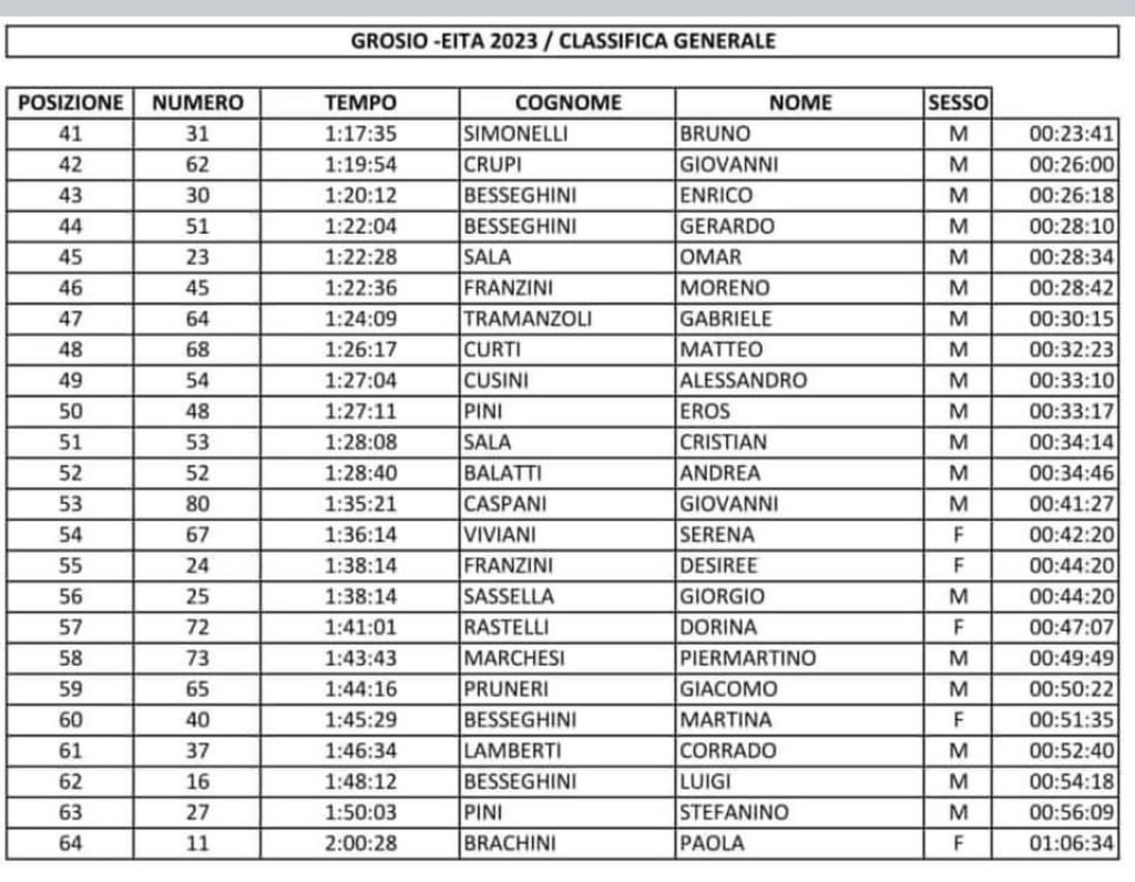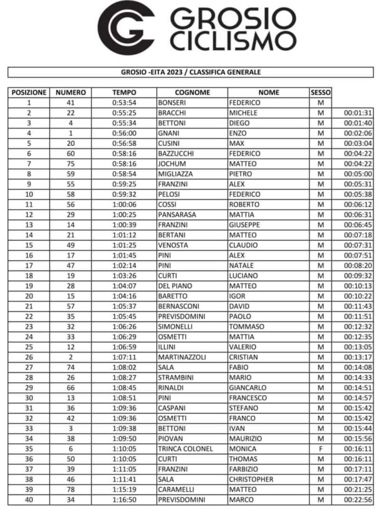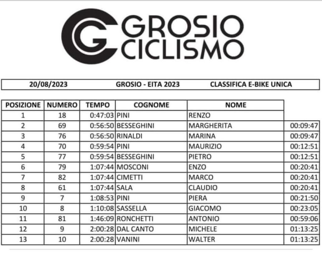 Nonostante il caldo ben 64 appassionati della corsa in bicicletta e della E-BIKE (13 concorrenti ) hanno partecipato domenica 20 agosto alla tradizionale gara Grosio/Eita, organizzata dalla Grosio Ciclismo. Da ben tre anni la gara è dedicata anche a Marino Zanetti, che ha partecipato molte volte alla manifestazione sportiva, salendo spesso sul podio. Marino è nei cuore dei valposchiavini ma anche di tanti valtellinesi che hanno saputo apprezzarlo sia come sportivo ma sopratutto come persona, si molto riservata, ma dal cuore d’oro. Solitamente sono tanti i valposchiavini che partecipano a questa gara, ma quest’anno visto la concomitanza con la Valmalenco/ Valposchiavo (anche dedicata a lui), a gareggiare c’era solo il suo grande amico e rivale in tante gare Matteo Jochum giunto al traguardo in settima posizione (0:58:16). Durante la premiazione è stata ringraziata dal commentatore Carlo Tonini, Cecilia Zanetti, la mamma di Marino per aver offerto i trofei. Anche Cecilia ringrazia di cuore, organizzatori e partecipanti, e si scusa di non essere stata presente alla gara, ma con la promessa che ci sarà il prossimo anno. Per la cronaca la gara è stata vinta da Bonseri Federico (0:53:54), e per le donne da Trinca Colonel Monica (1:10:05). Si ringrazia Pini Stefano per le foto.